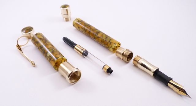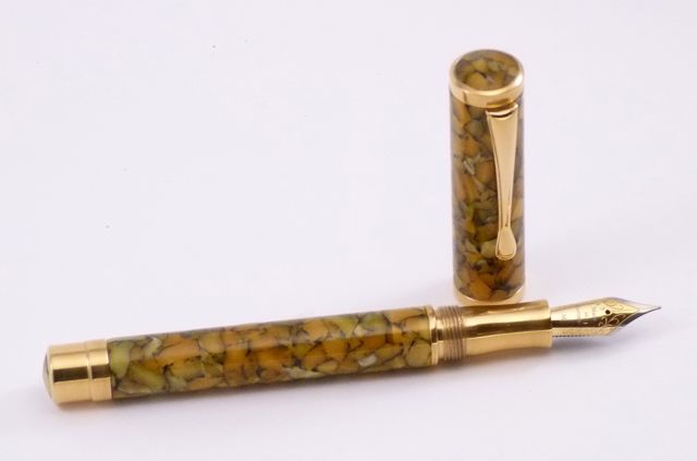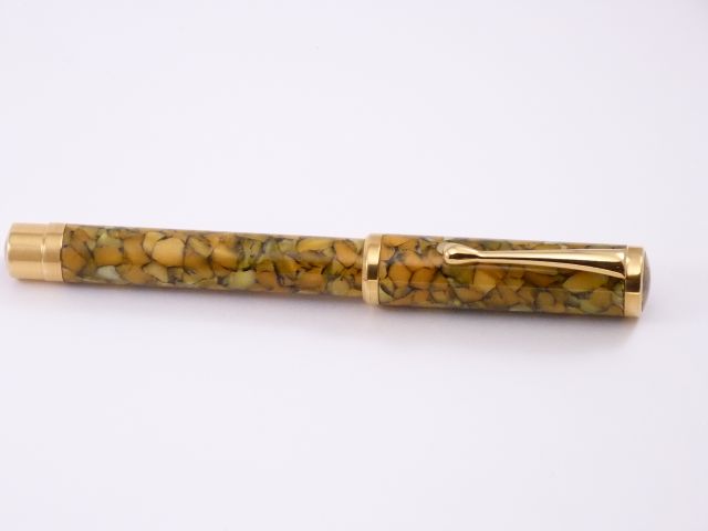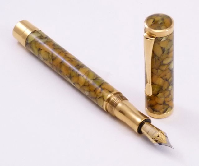 Sunflower resin from Exotic Blanks, #6 Medium Two-tone Meisternib. Section, couplers, and finials are machined from brass, and gold plated.