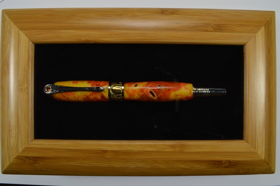 1st one is stabilized double dyed red & yellow Buckeye Burl. I used to do (and still occasionally still do) a lot of solar observing and this blank shows so many knots that literally look like sunspots! Even the colors are very close!!! Thus the name "Sunspot Serenade"
