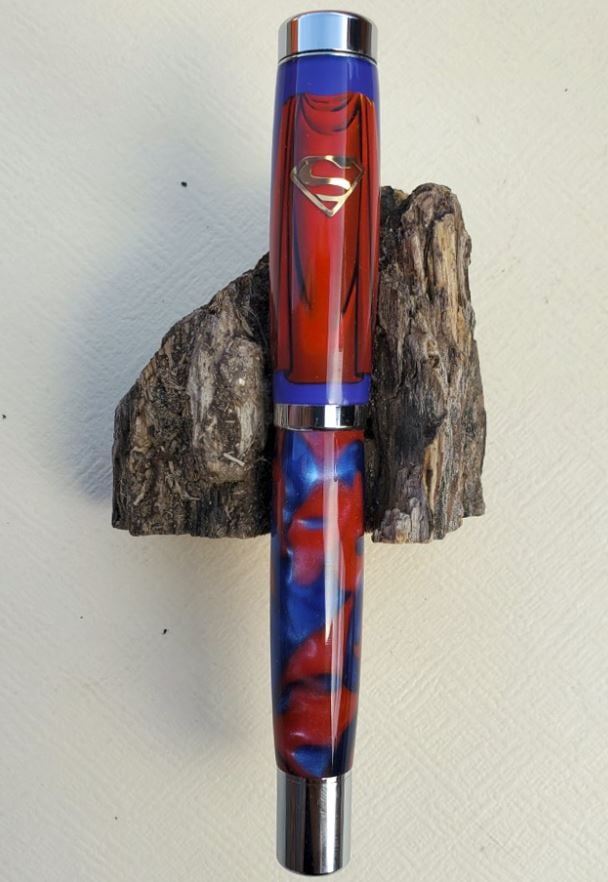 Here is a Superman pen I crafted. .I imbedded a Superman "S" bracelet charm on a Superman cape and cast it. The blank is called "Superman" that I purchased from Wood World in Dallas.