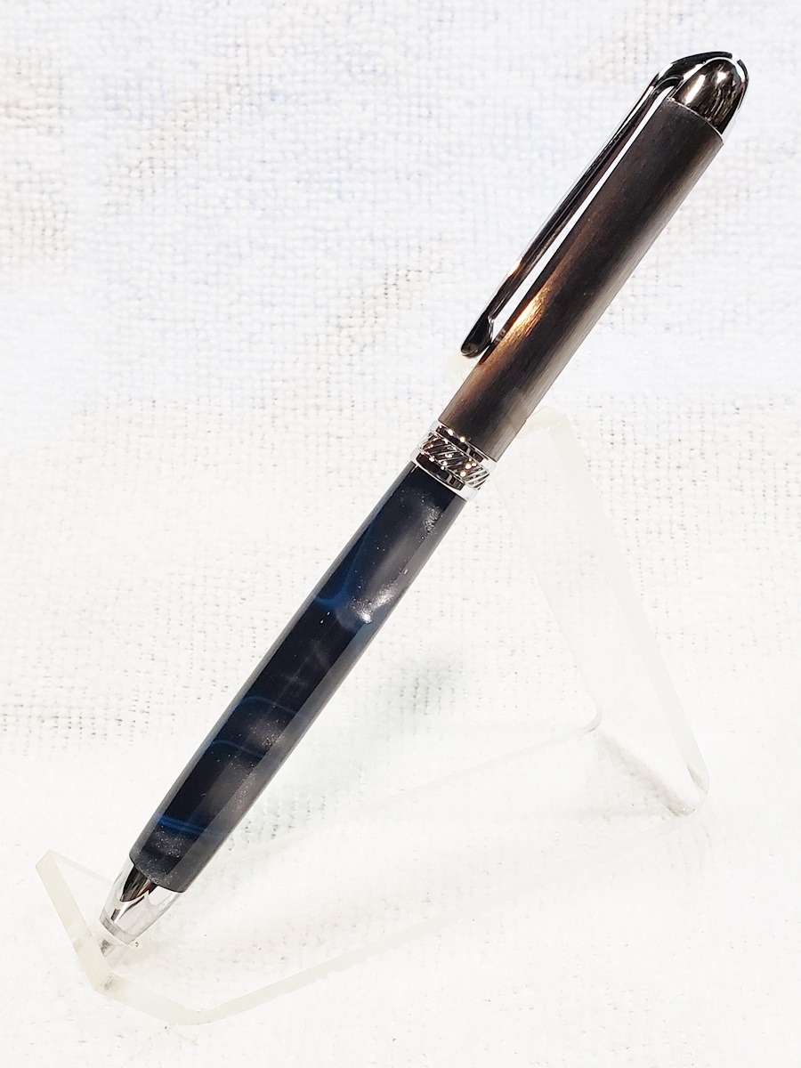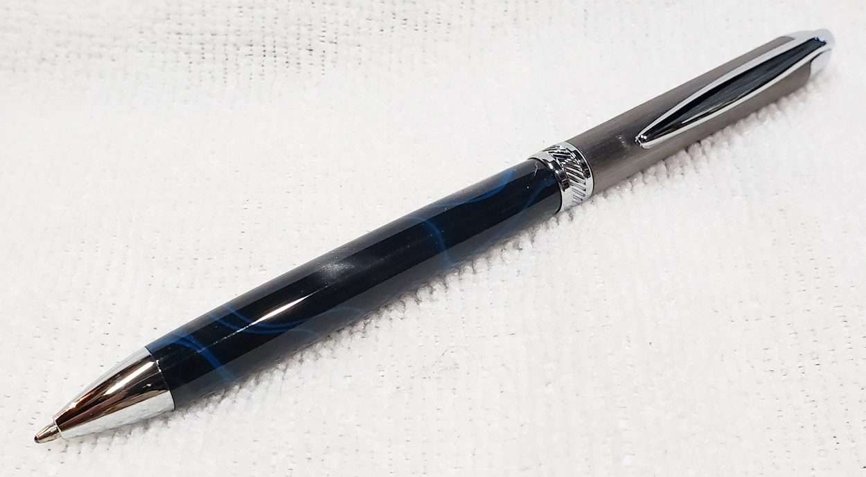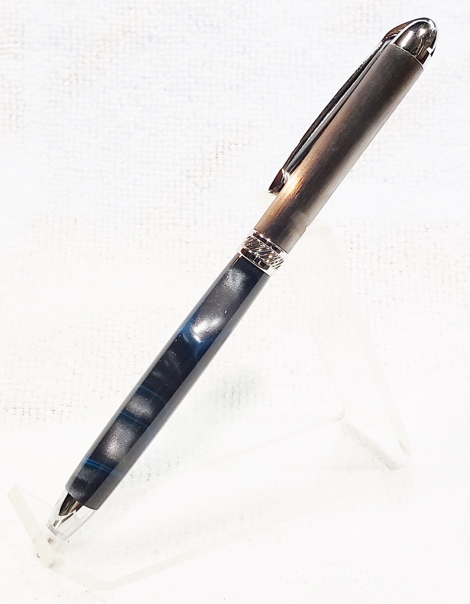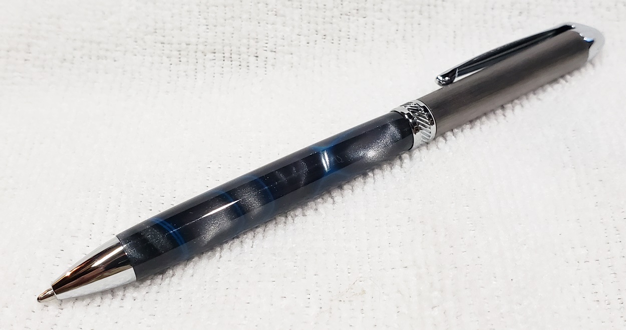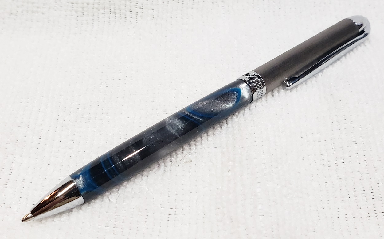 This is another Slim Hybrid pen, in chrome and gunmetal. But I ordered it from Berea, and they call them Surfix Duo. I don't know what Surfix means, and I don't know why Woodcraft renames them. But Slim Hybrid makes more sense to me than Surfix. Anyway, the blank is called Stormy River, which I've turned before. I back painted it black to make it a little darker. I also turned this body a little "fat", instead of straight like I did the other ones I've made. I'm very happy with how this turned out.