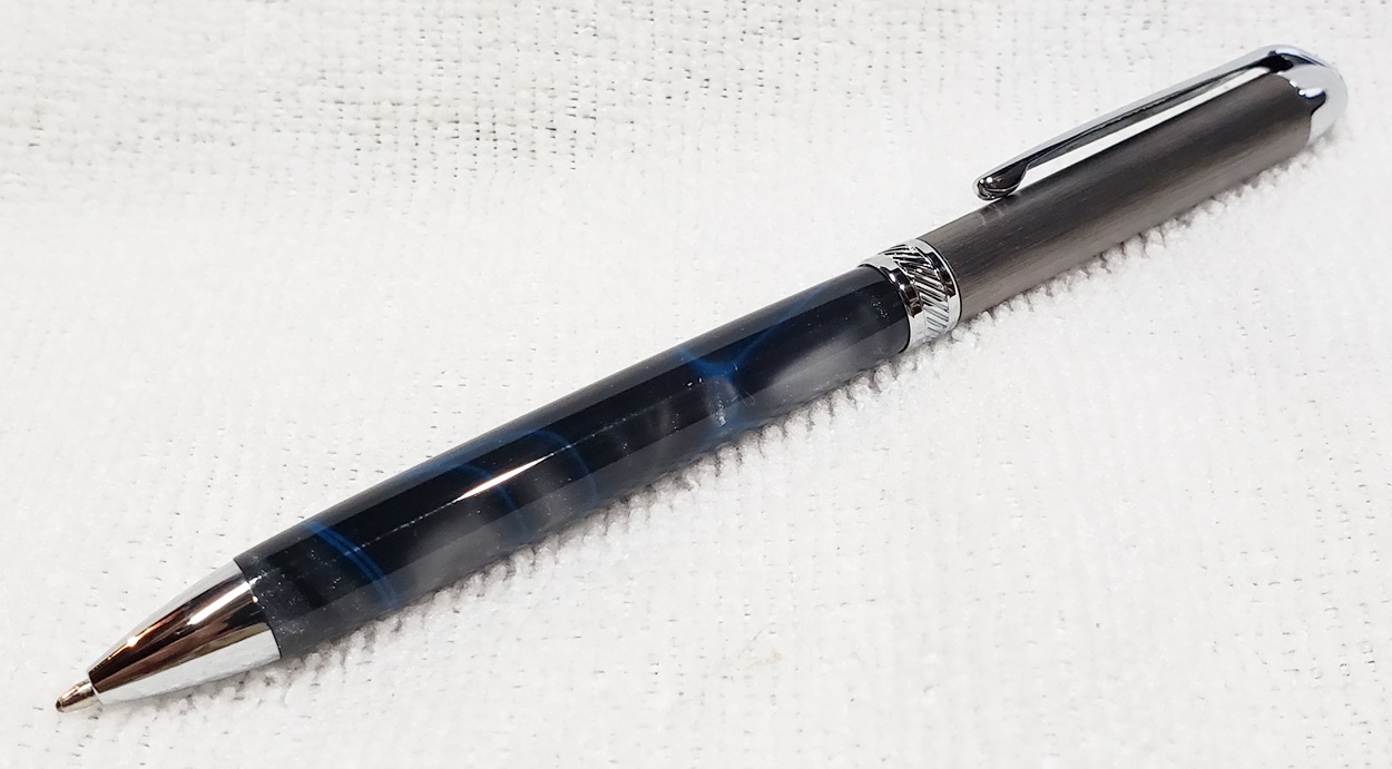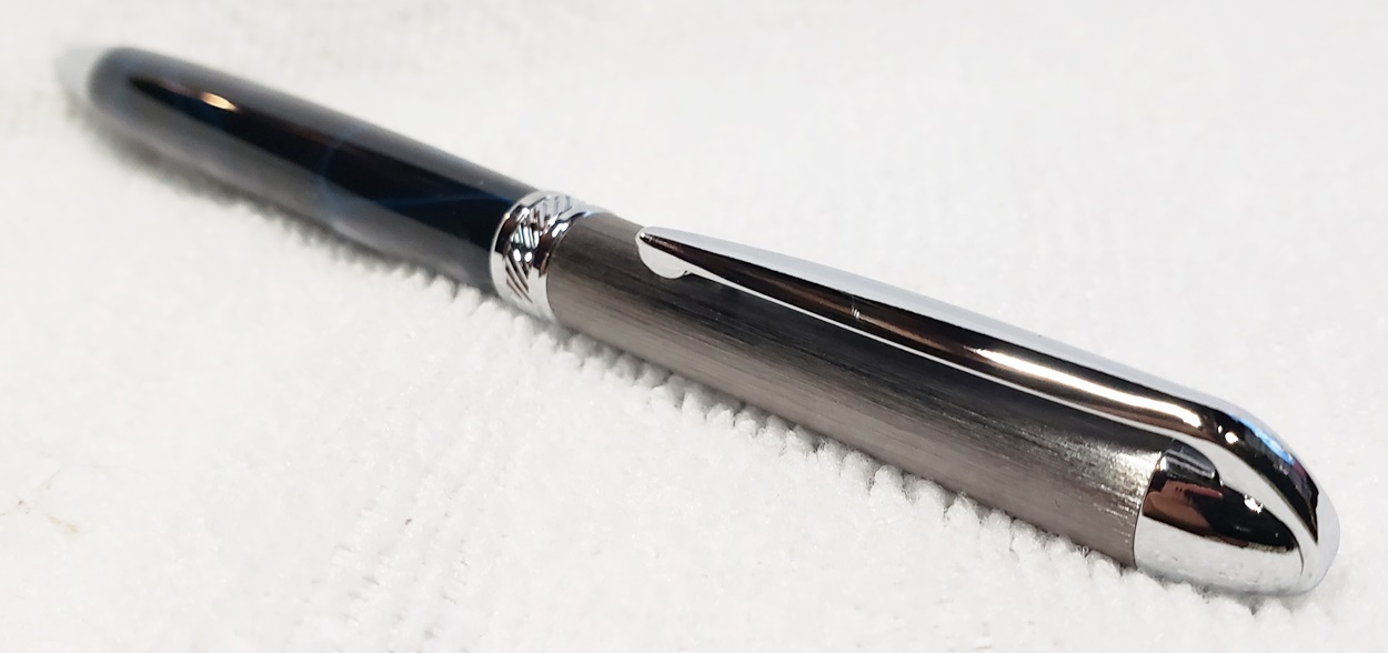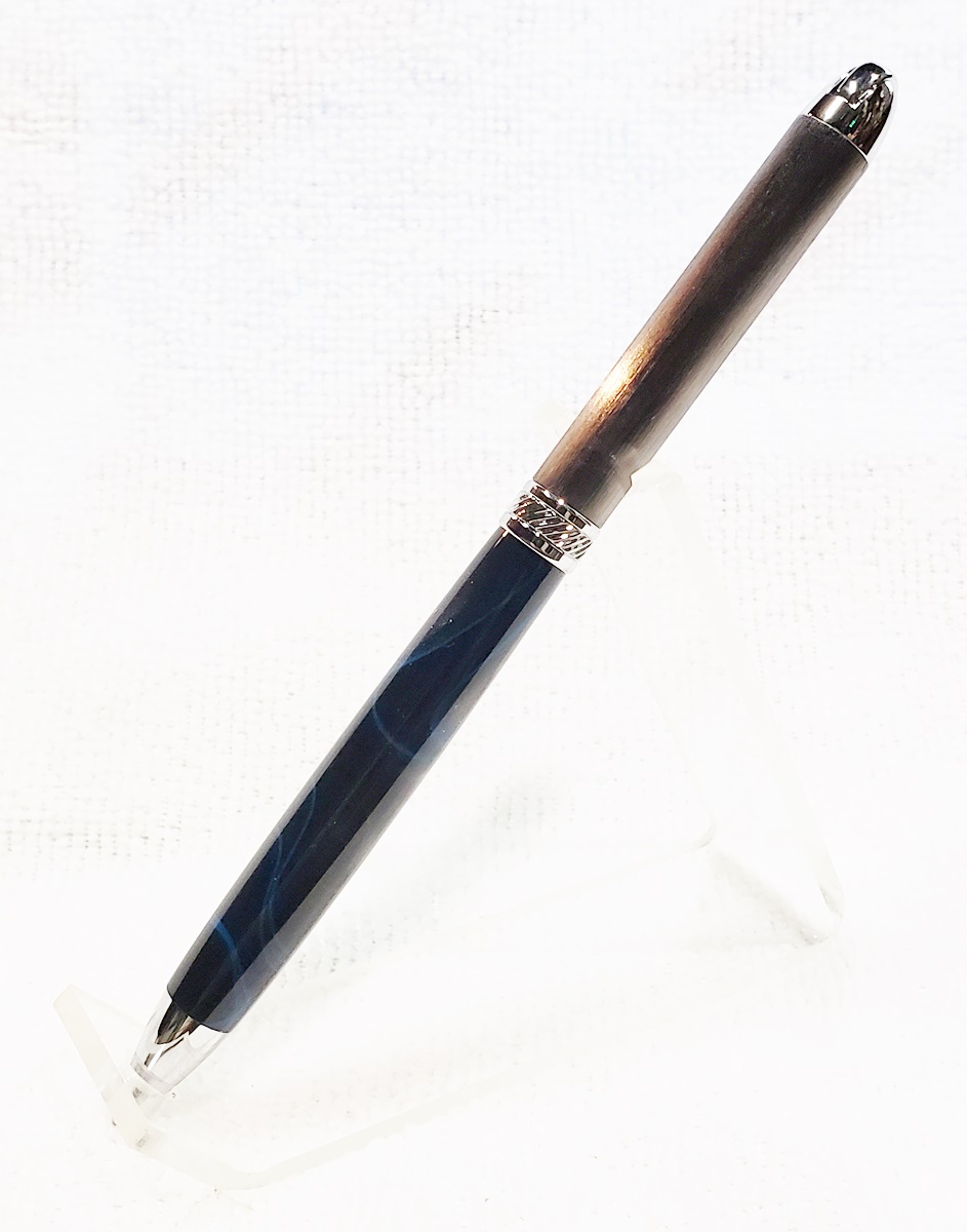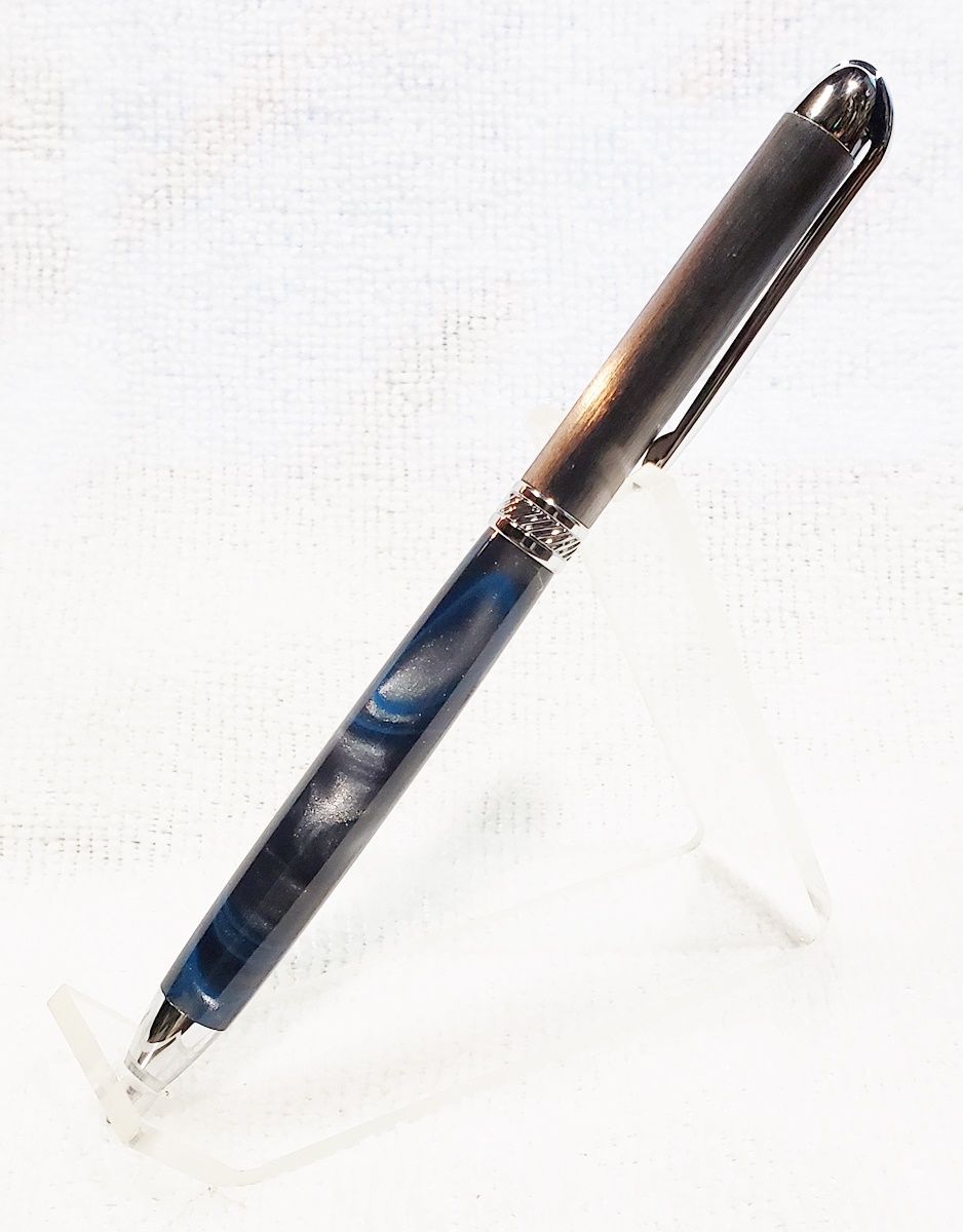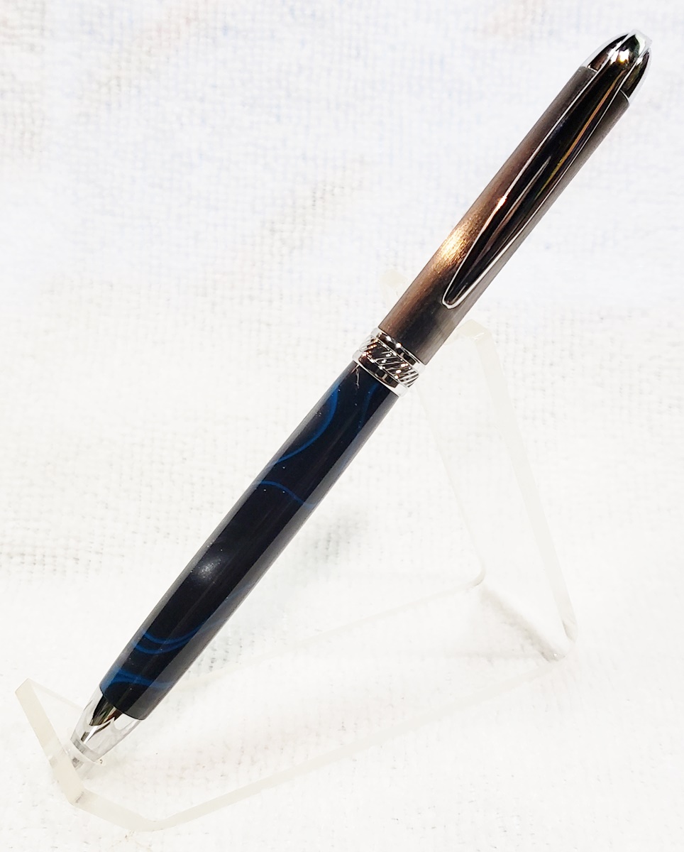 This is another Slim Hybrid pen, in chrome and gunmetal. But I ordered it from Berea, and they call them Surfix Duo. I don't know what Surfix means, and I don't know why Woodcraft renames them. But Slim Hybrid makes more sense to me than Surfix. Anyway, the blank is called Stormy River, which I've turned before. I back painted it black to make it a little darker. I also turned this body a little "fat", instead of straight like I did the other ones I've made. I'm very happy with how this turned out.