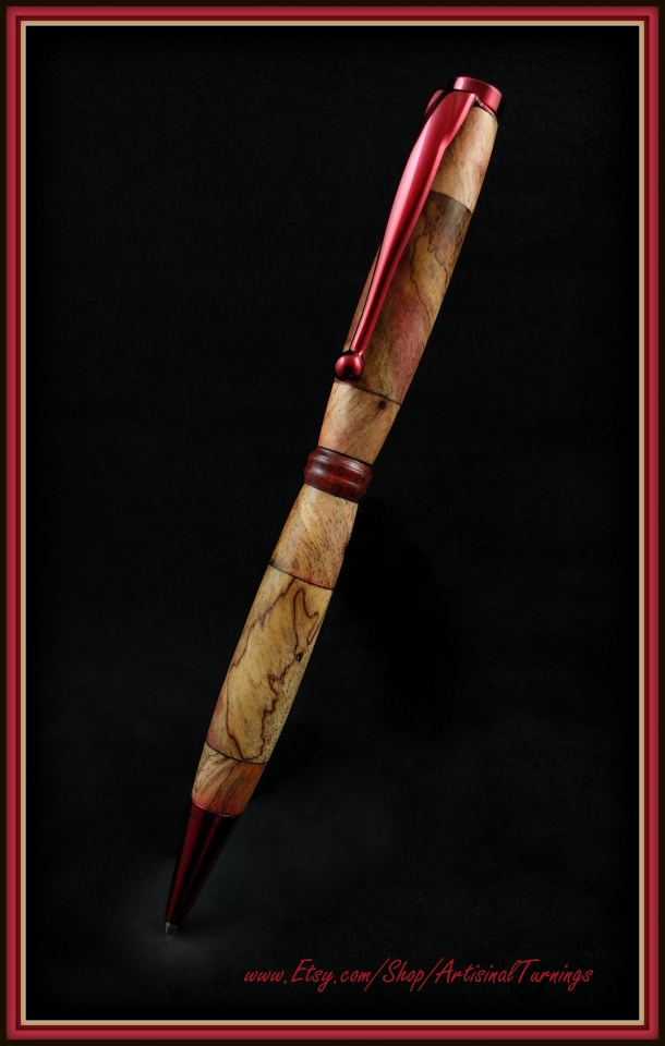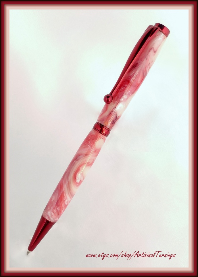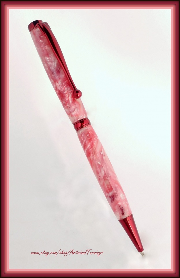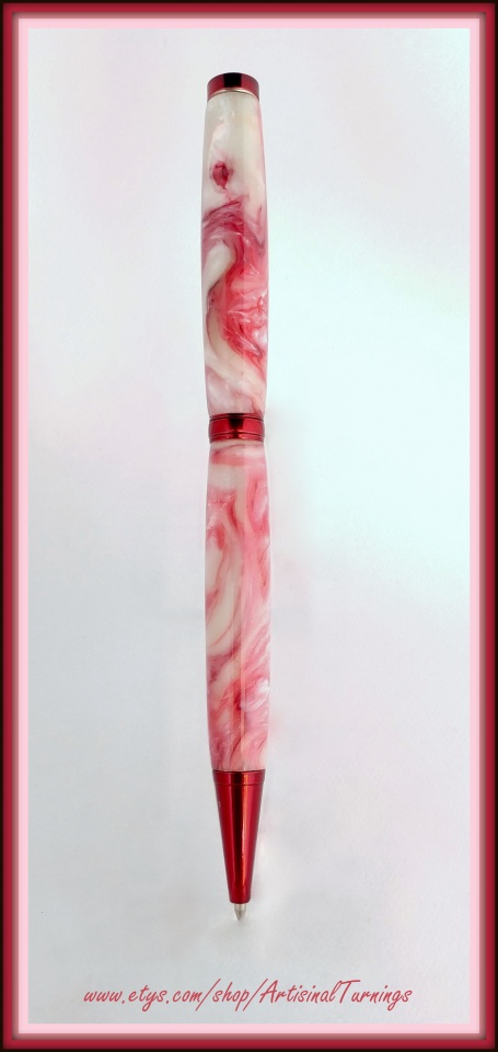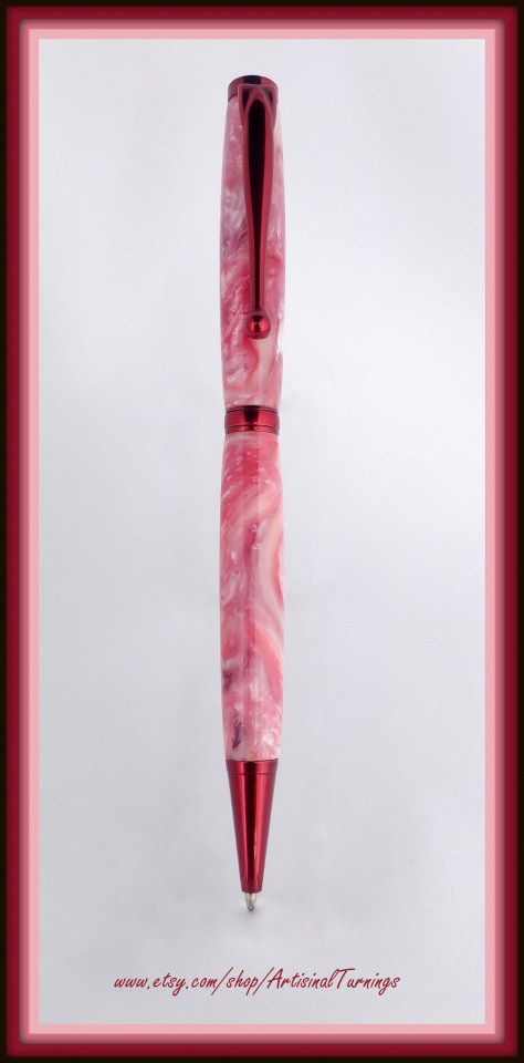 The raspberries and cream blank makes me crave something sweet every time I look at it. Has to go! As I was turning this Slimline I was thinking that it's probably the least expensive kit you can buy but it's definitely not the easiest to turn. It seemed to take forever getting to the final profile and as I got close I decided to take a break so I didn't mess up the final passes. I'm hoping it will be a hit for Mother's Day. I couldn't resist using the red pen kit. What do you think?