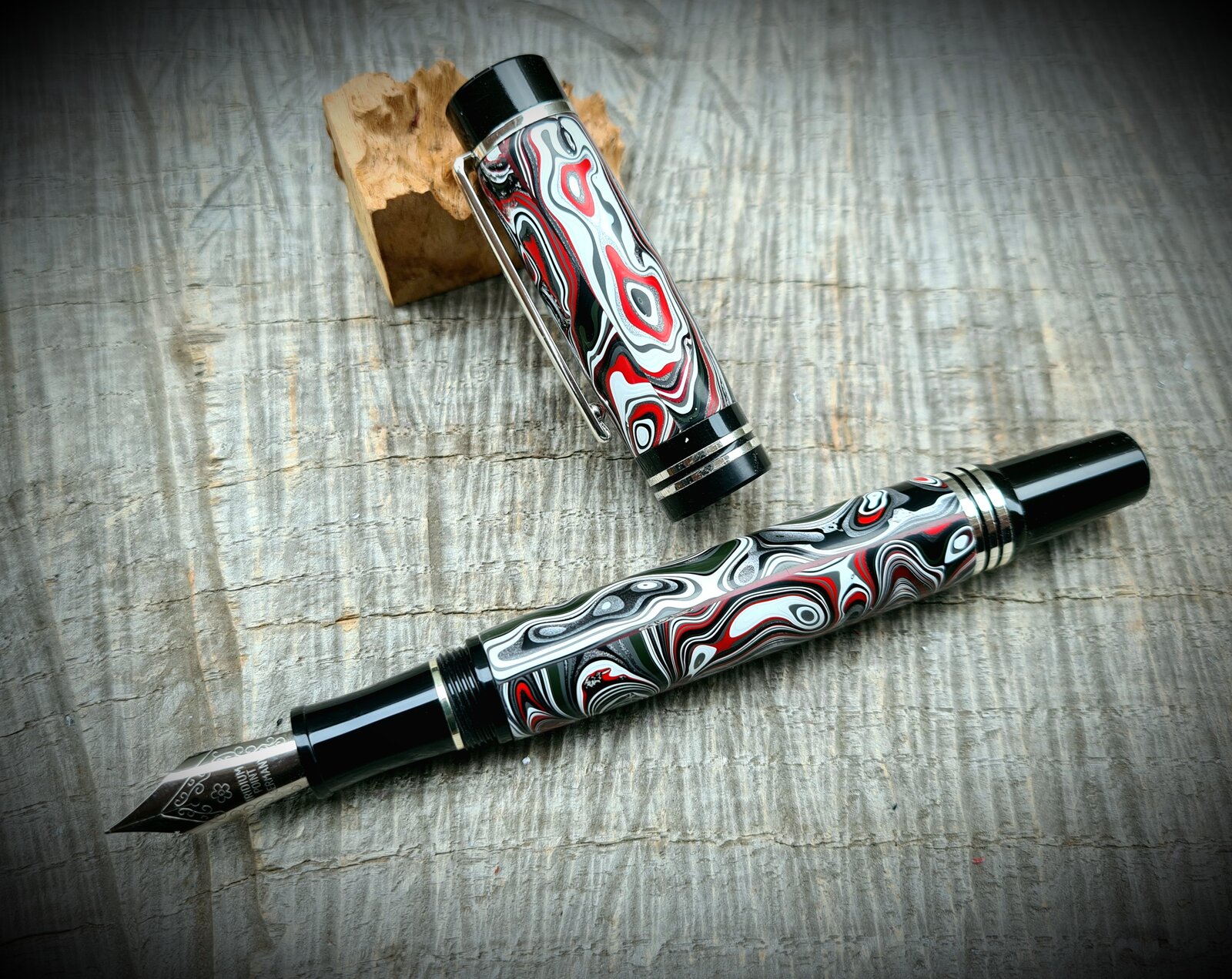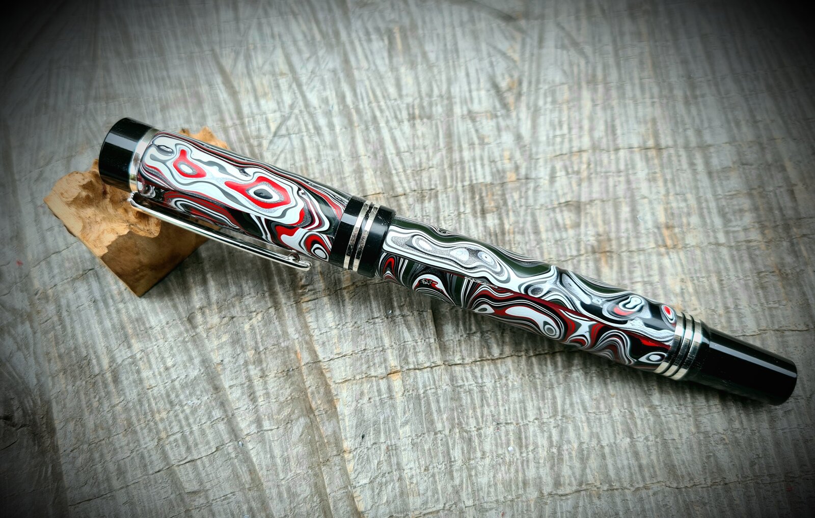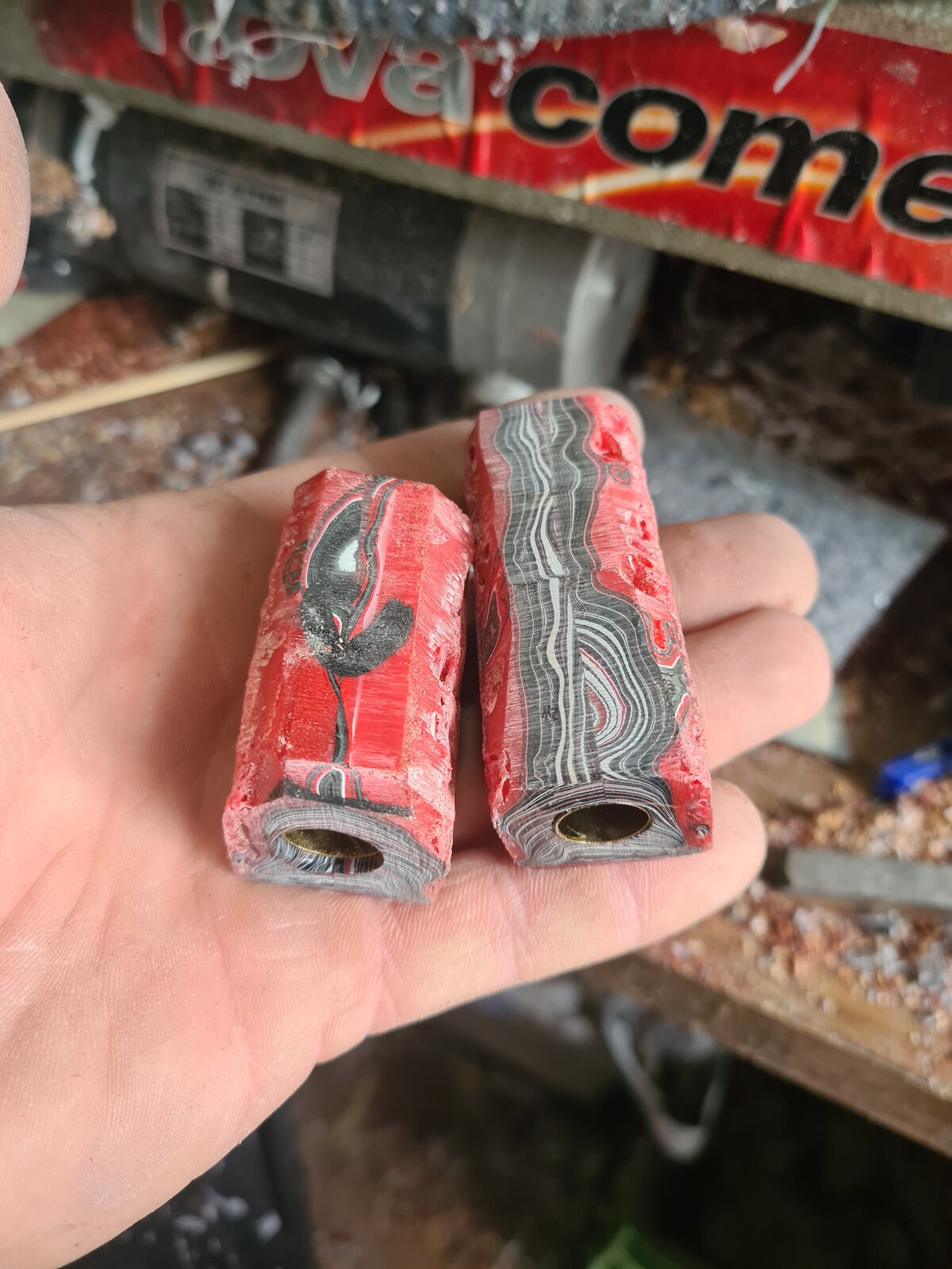 I decided to slice the edge off a slab of fordite that I purchased which had lovely drips and odd shapes. I cut it length ways in half and glued them back to back, cast them in red resin to fill the gaps and voila!