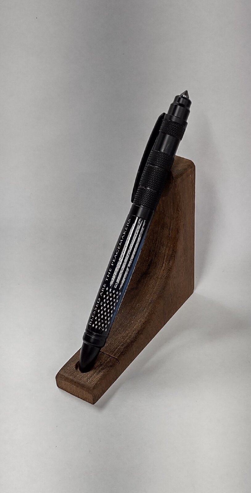 Been under the weather since Christmas, so have not gotten much if any shop time. I did get this cast yesterday and turned today. It's a Tactical Pen from WoodturningZ. The blank is a "Blessed are the Peacemakers" American flag with thin blue line. I use Liquid Diamonds resin.