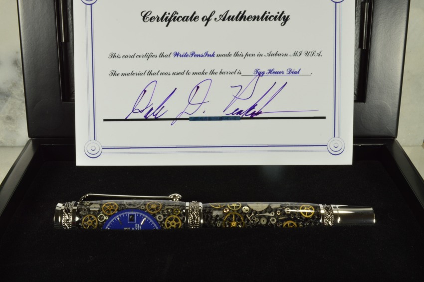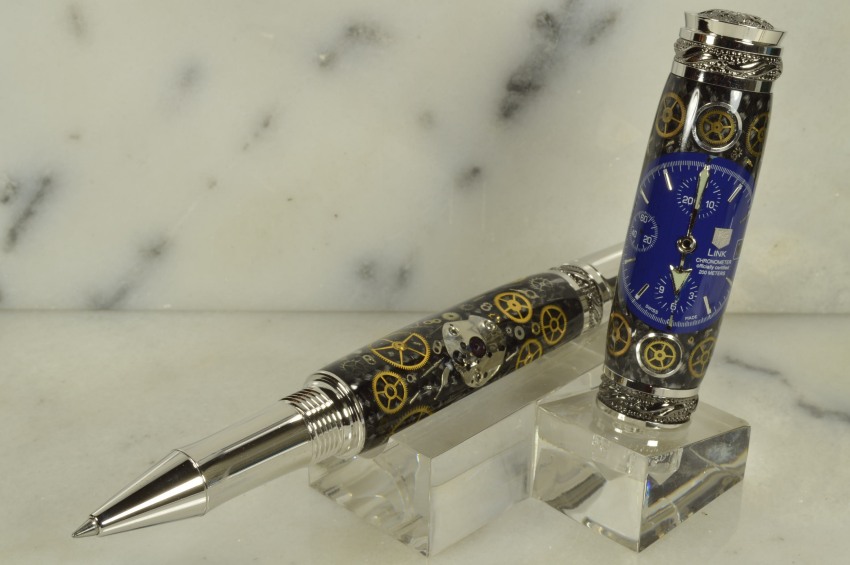 Here is another watch part pen that I just finished up today. Turned out very well! I'm pleased with it! Full size Majestic in RB configuration but can convert it to a FP in seconds. All on Carbon Fiber wrapped barrels.