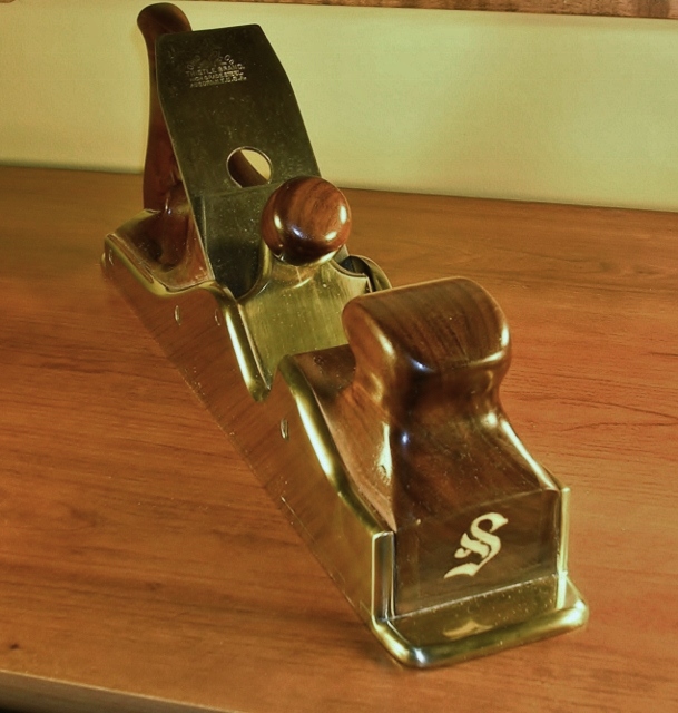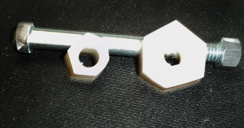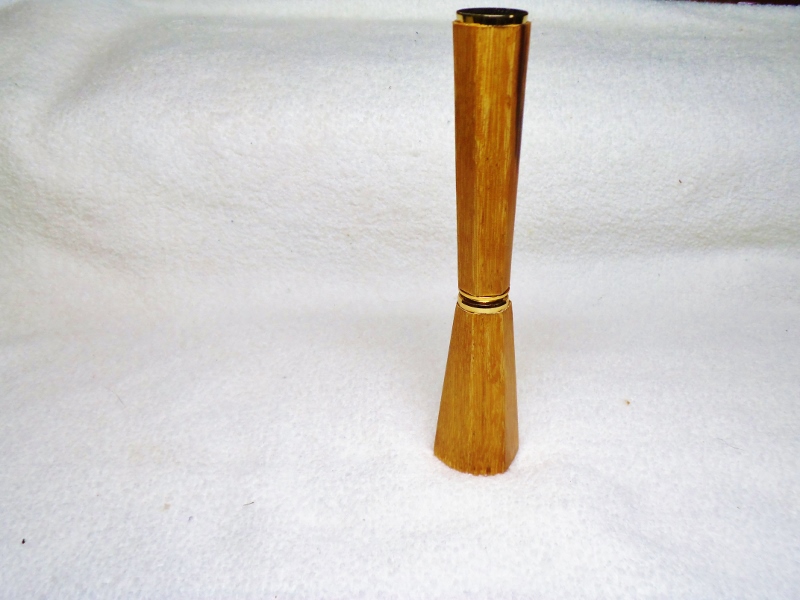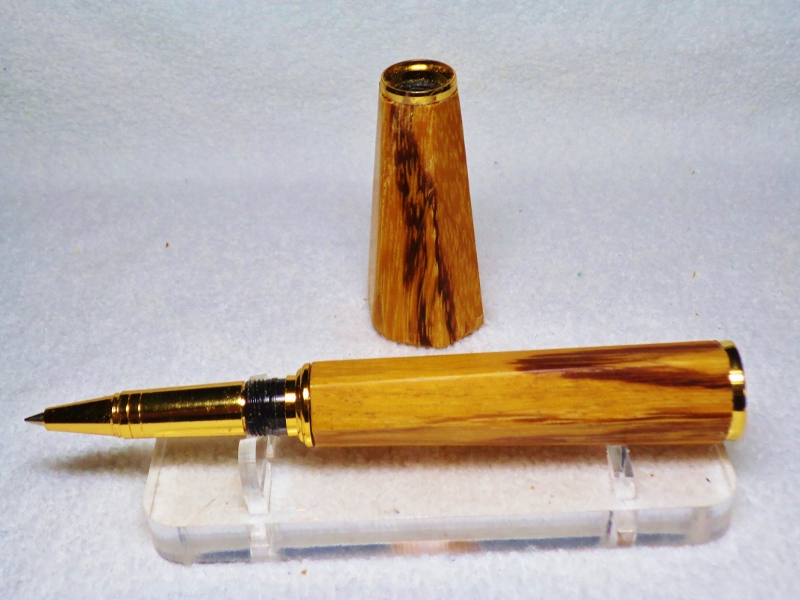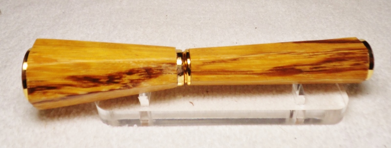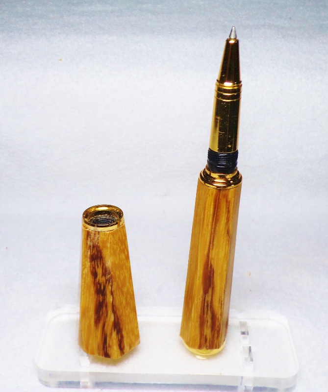 This is a Gold Rockler Spirit pen. The blanks are tapered hexagons in Marble Wood. The kit has been modified in several ways. There are no tubes used in it's making. End caps have been reversed in size to make it more streamlined and the lower section made longer and wider at the base. There was also no lathe used to make the blanks only the 4 pieces shown in the photo plus a drill press, disk, and belt sander. Finish is sanded to 1200 grit after apply 8 coats of thick CA and than polishing with One-Step Plastic Polish. The 4 pieces shown are a 3/8" nut and bolt, plus 2 hexagon templates made from a cutting board and drilled and sanded to the size I wanted. I left the corners proud so it looked like it was sitting on a gold base. This will be my new desk pen of the month. Praise me if you can, blast me if you must !! Jim S