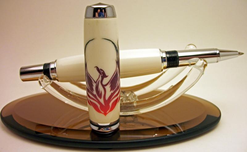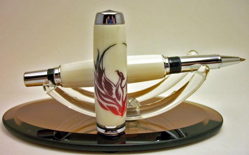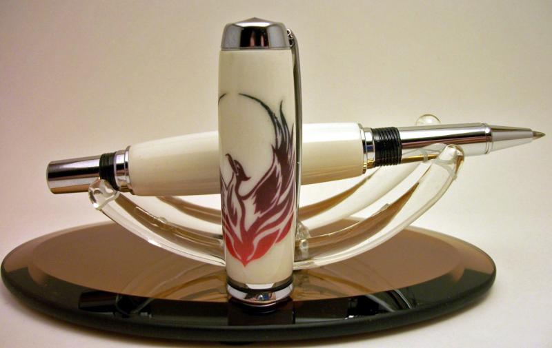 While standing in the check-out line at Wal-Mart I saw some packs of "Twisted TRIBAL TATTOOS" these are for kids (the wet and stick type) and the little night light in my head went on. :confused: So this is what I came up with. the blank is plain white PVC pipe turned down to size, I applied the Tattoo and let it dry. It has three coats of thick CA, wet sanded to 1500 and plastic polished. The Pen Kit is a Jr Gent. I have had issues with this kit, the center band keeps crushing during assembly, :mad: I think it's too big for the tube.