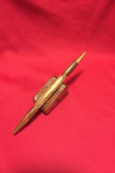 The center is Oak, the black end is cocabolo and the red end is mystery found wood that had red hues in the heart wood.
