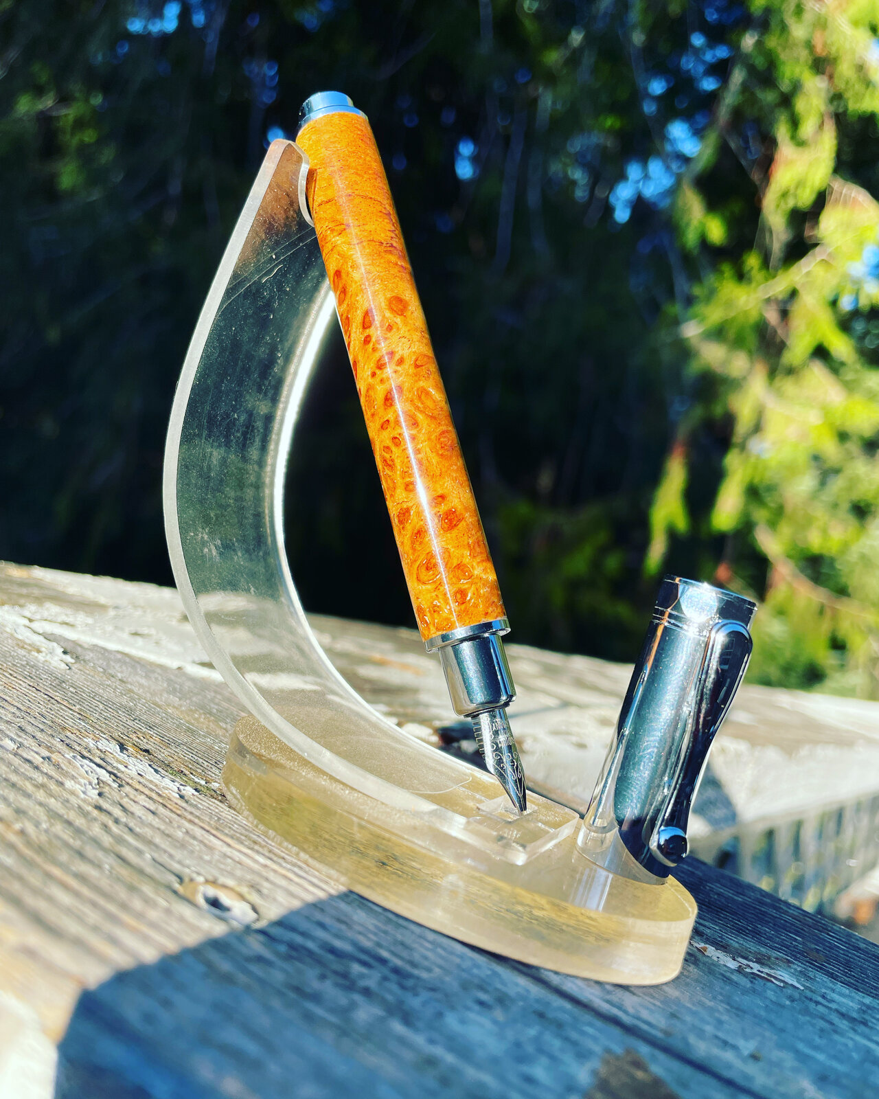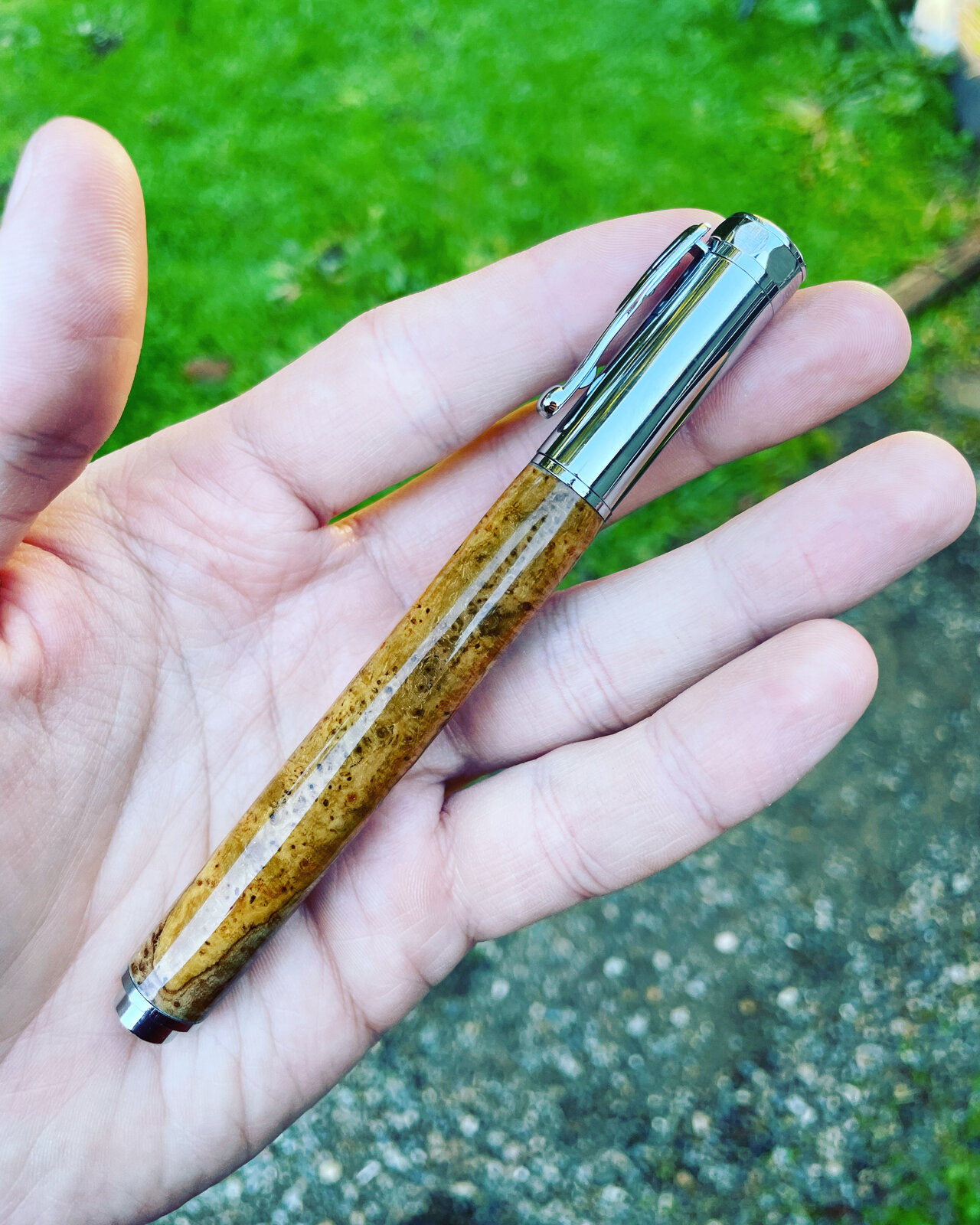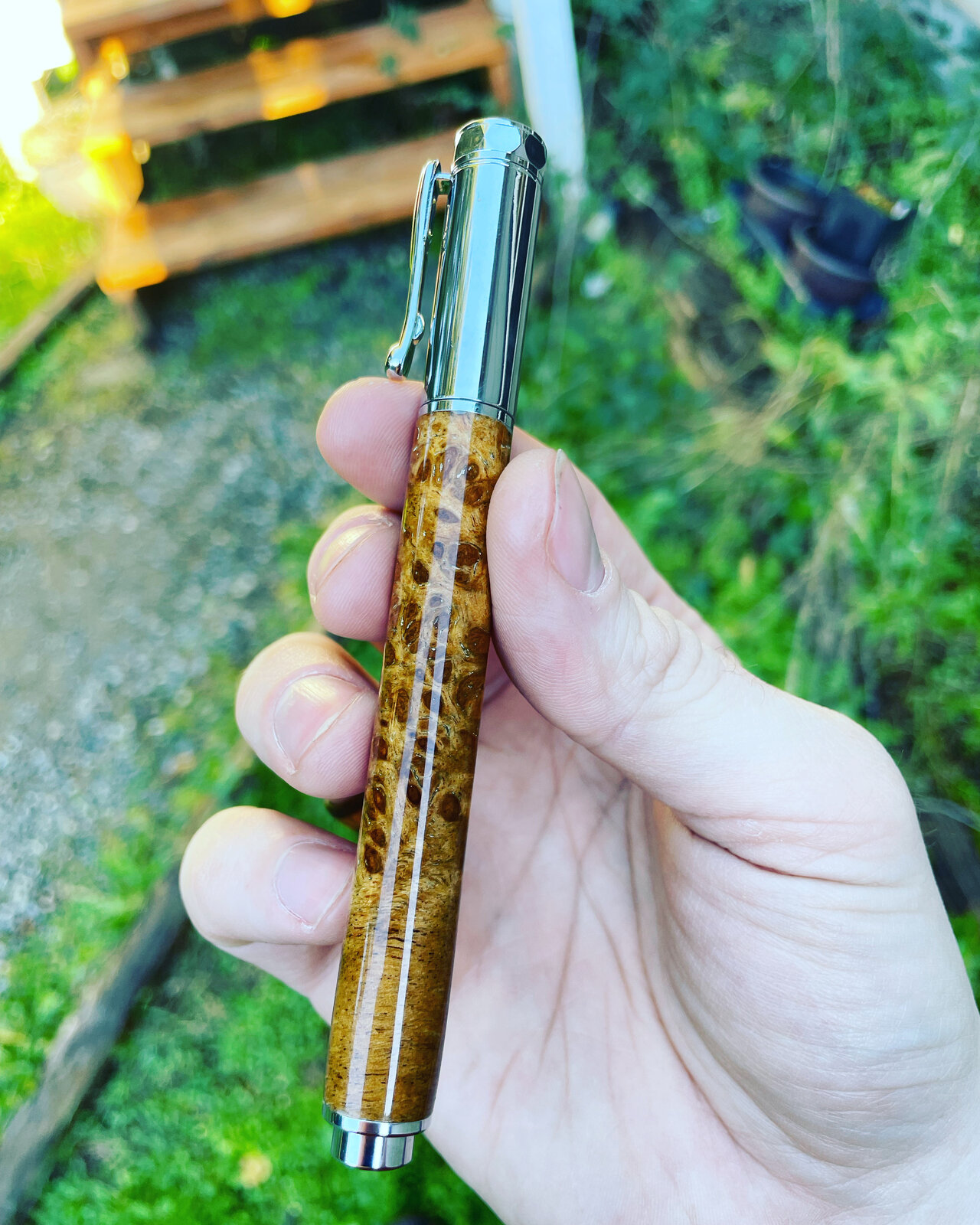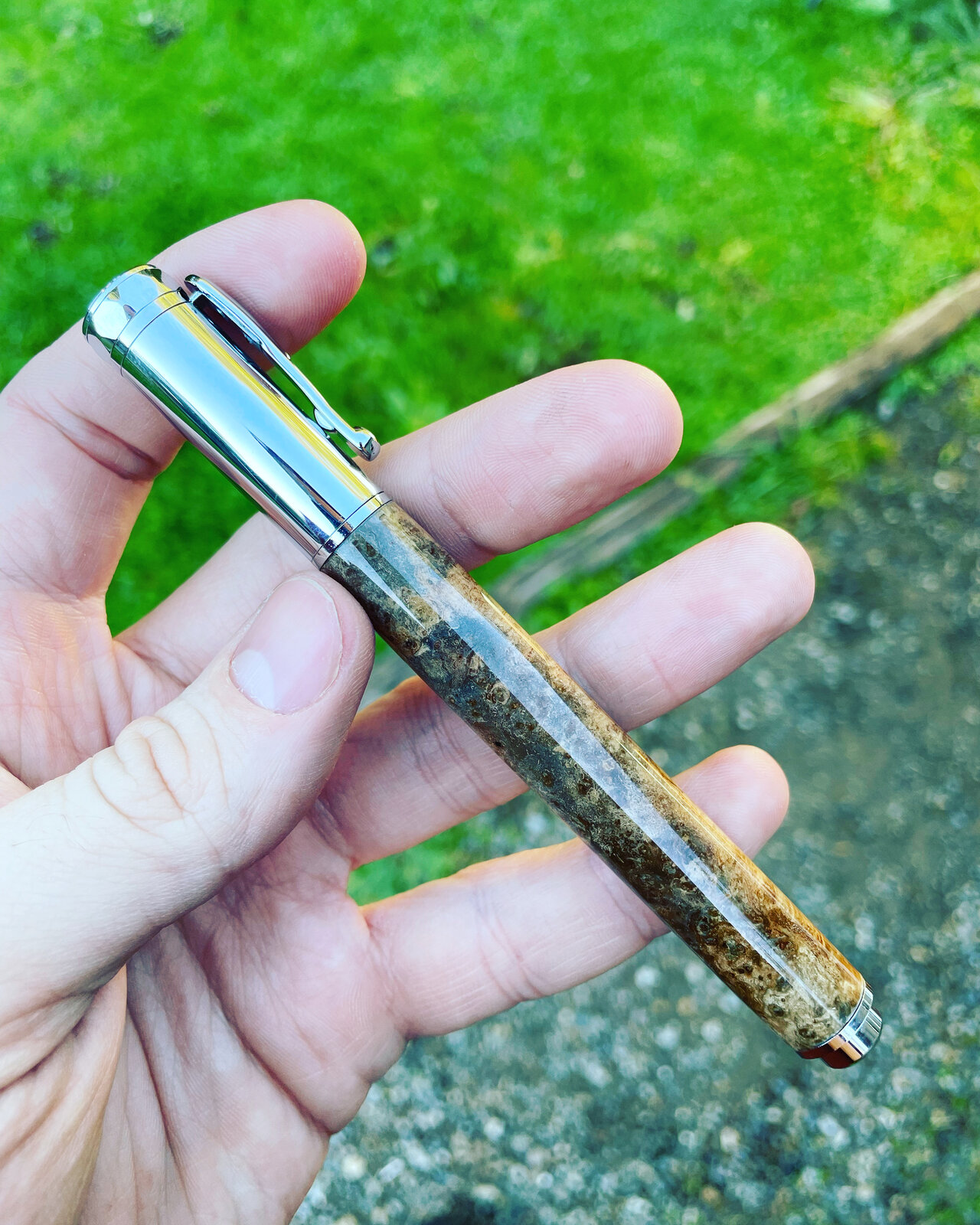 2 chrome Zen fountains from ExoticBlanks.com, one with a particularly bland piece of Canxan Negro, and one with a nice piece of Teak burl and . Rushed the CA finish on the Canxan so there were still some low spots which is why there's little bits of dust in them. After I hit it with the compressor it'll be a passable pen. 😂