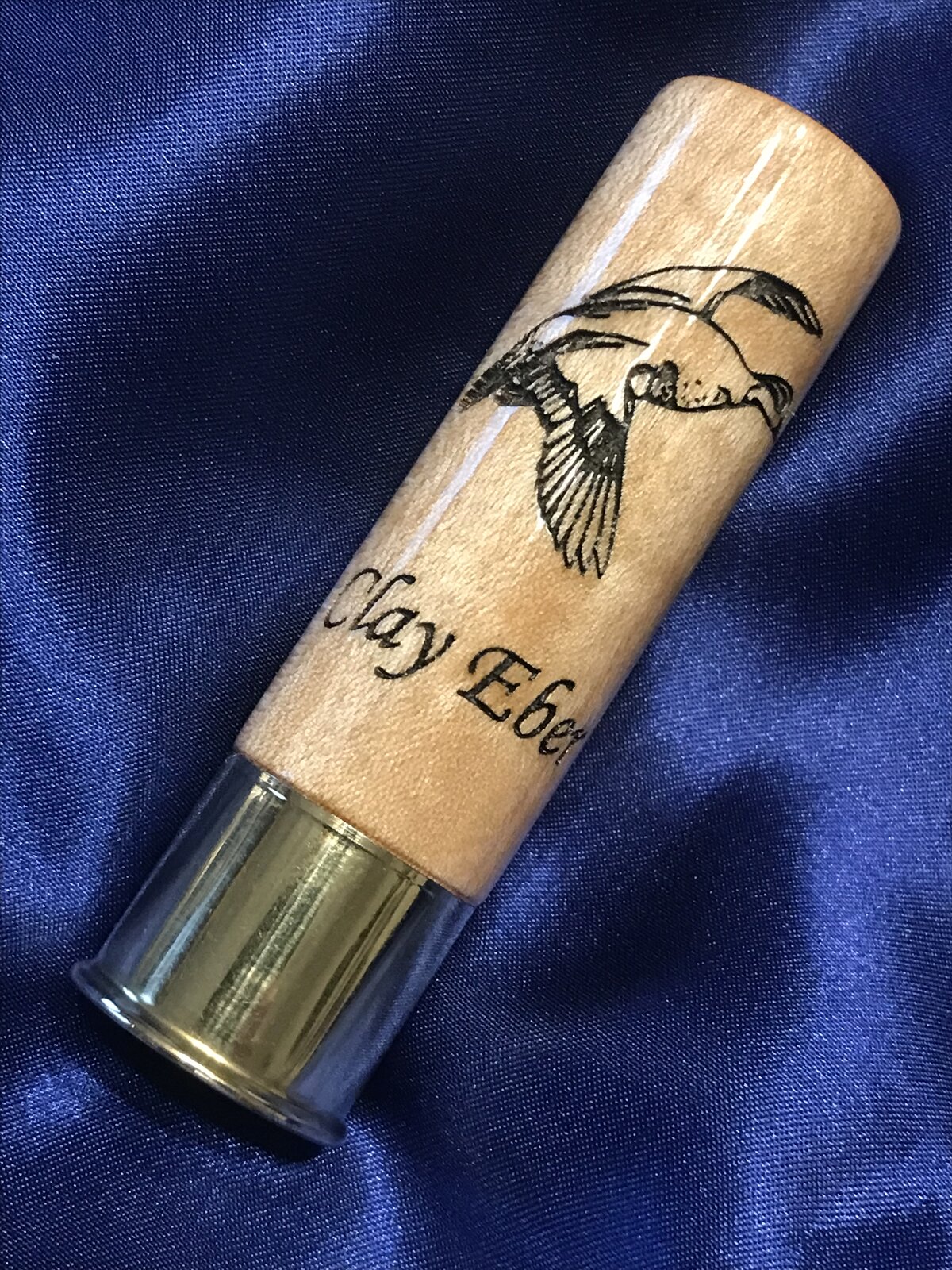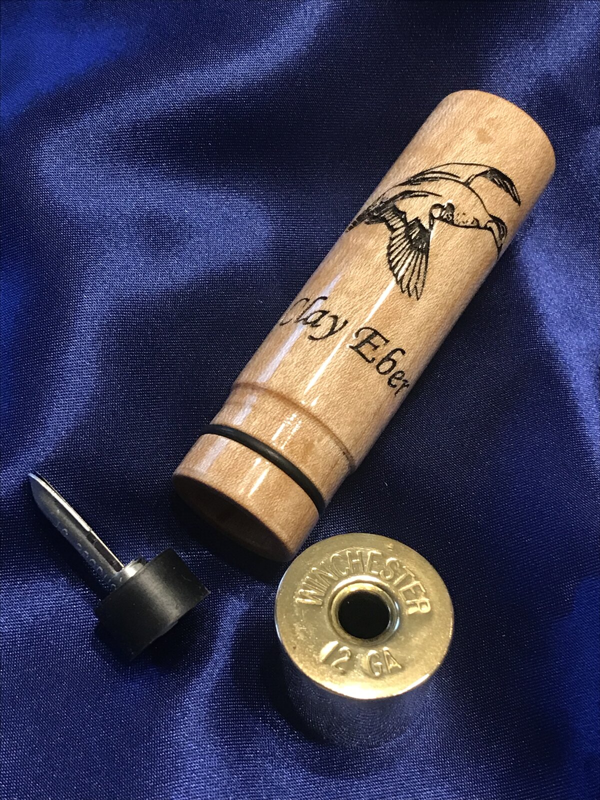 John T asked what we were working on and I replied that I was making a couple of pens for a friend. While I'm waiting for the resin to cure I made the same guy this shot shell call. The brass is a 12ga shell cap with a maple barrel. I engraved his name and a Greenwing Teal in it to practice with my laser. Questions and Comments Welcome. Thanks