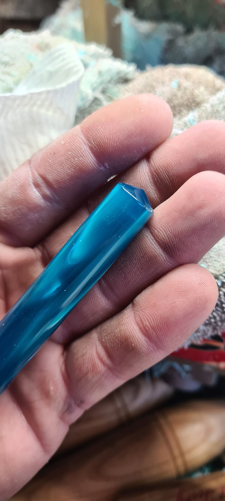 The customer wanted my interpretation of a Nakaya Piccolo cigar, hence the low pointed finials on the 3rd picture which looks more blue in the low light of my shop.