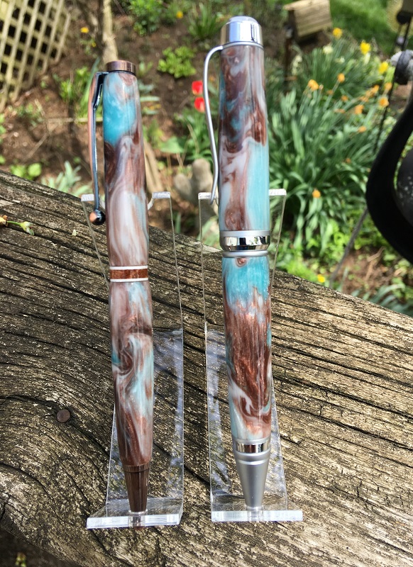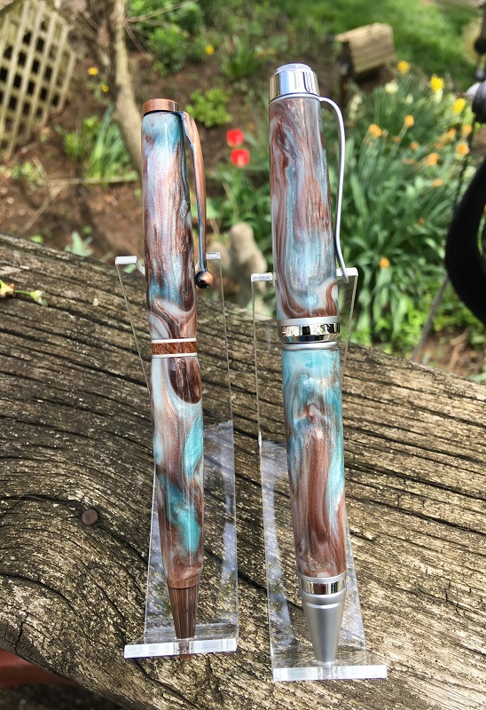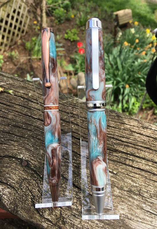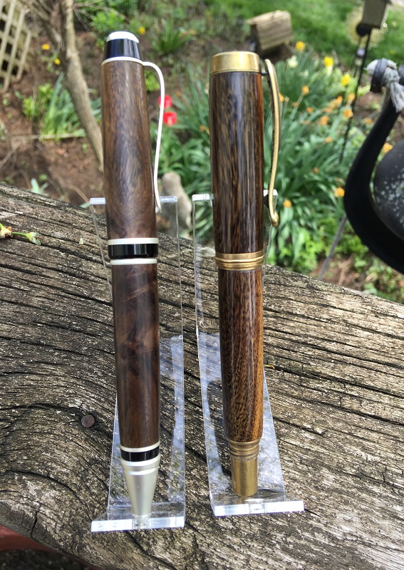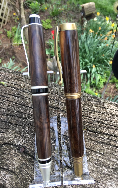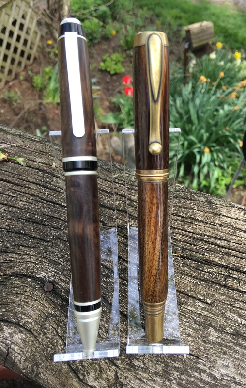Recent pics of TX Ebony pens motivated me to take pictures of these. Got a few small 12" long logs of Texas Ebony recently, and made the pair below from the same cut. The cigar is just pure Carnuba wax, the Jr is CA as I wasn't buzzed by the look of the wax--though I do prefer the feel and the up-close look. Interesting comparison for me--and I may disassemble the cigar and try it with WTF.