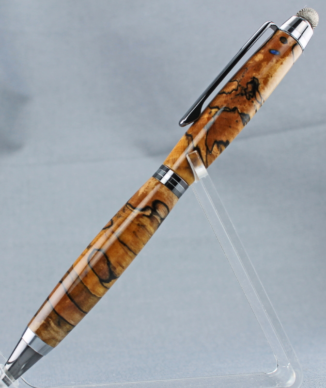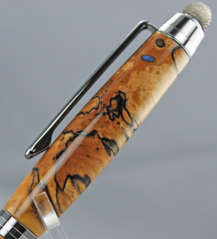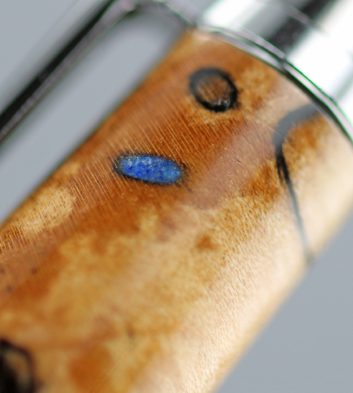 Black line spalted Oak on Tetra Stylus twist. A small hole appeared during turning so I filled it with Blue Lapis stone that I crushed into a powder. Finish is CA
