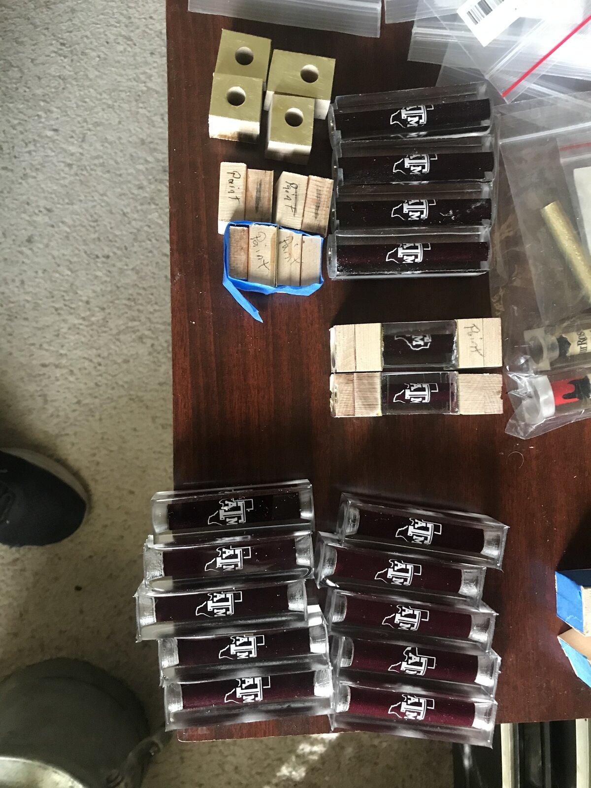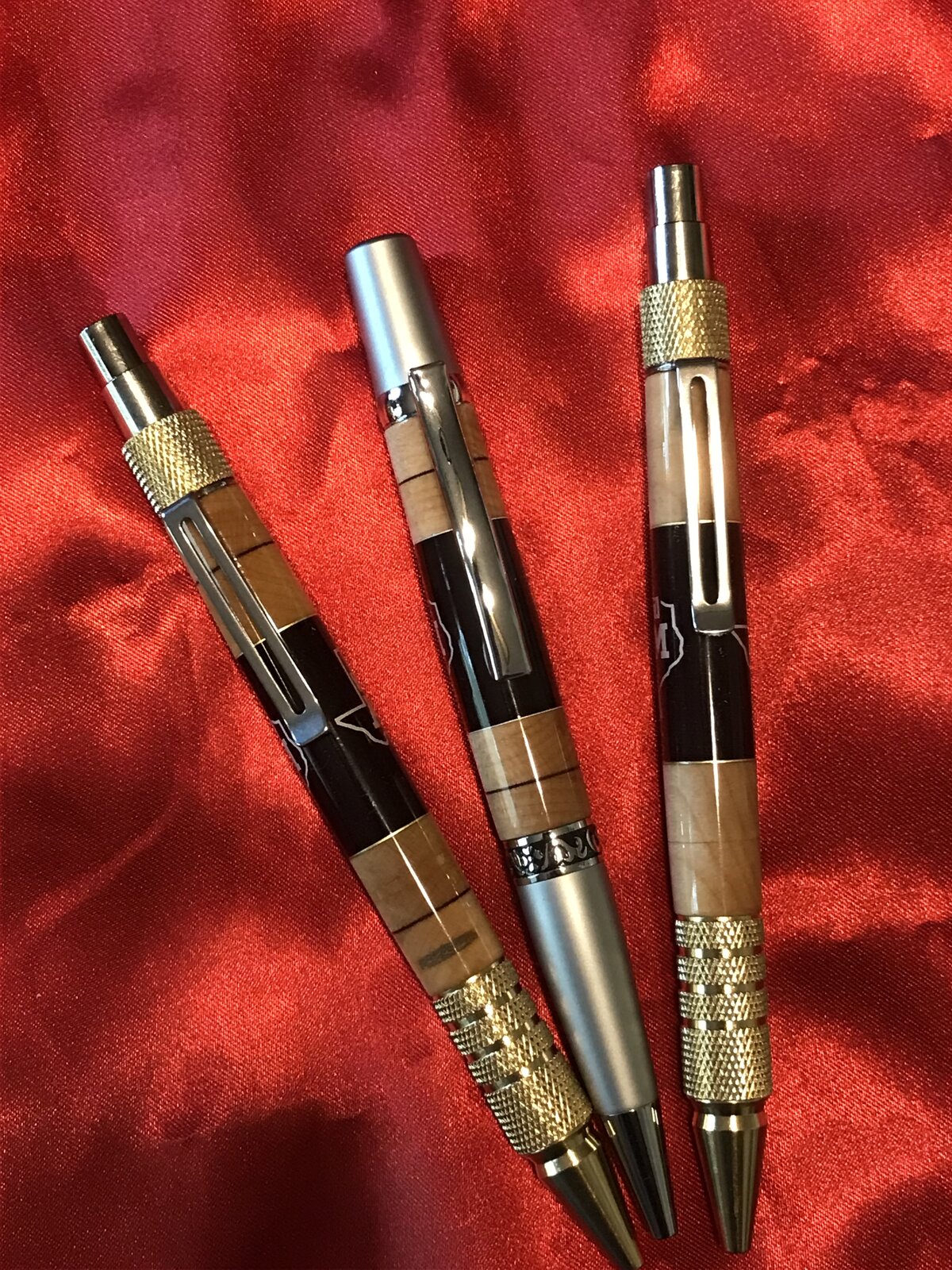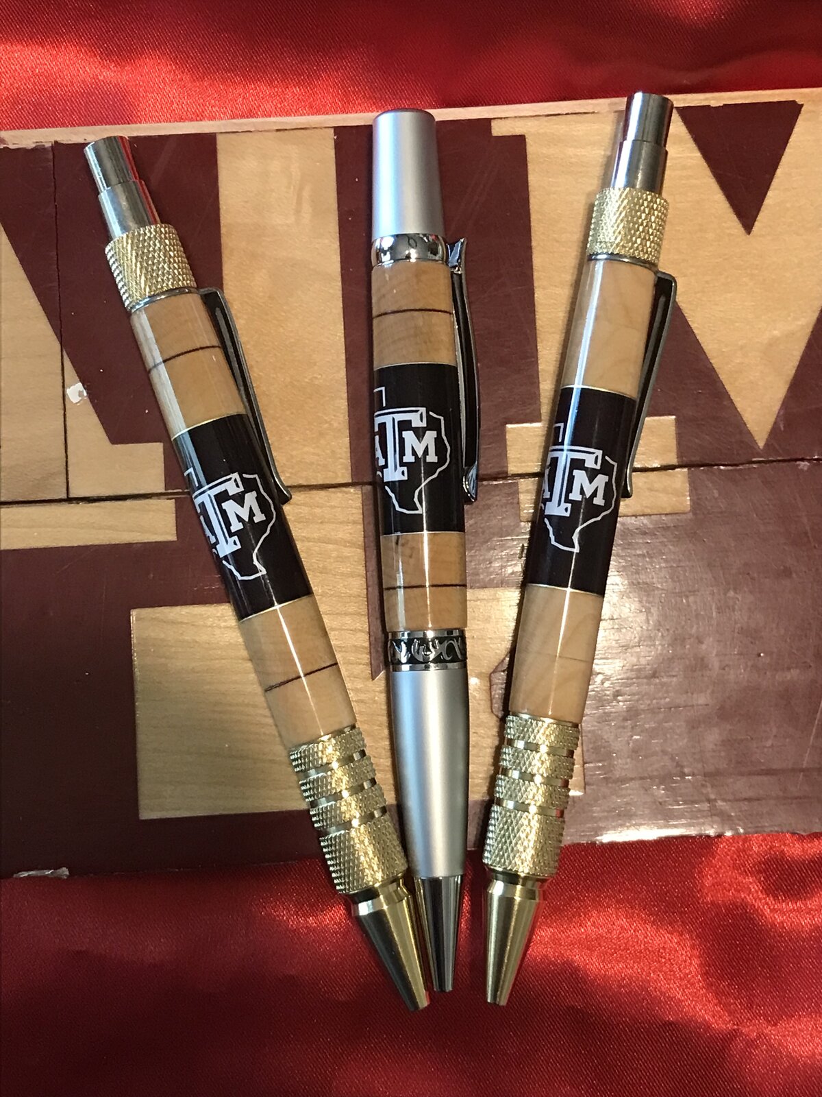 It finally paid off. I give more pens away than I sell. Way More! Anyway I made a coworker of my son an A&M pen for when he graduated. He's now working for the university and they just replaced a basketball court floor there. The person over all that made the comment "It would be nice to be able to make something out of all this". That when the guy I know said "I know someone that makes really nice pens". Here's the first three out of the box. The center is a vinyl logo on cloth with the actual court floor on the top and bottom. The dark ring between the two layers of wood is the actual maroon paint that was on the floor. Questions and Comments Welcome.