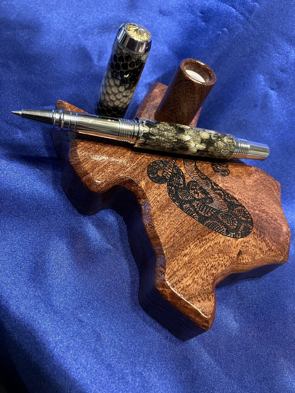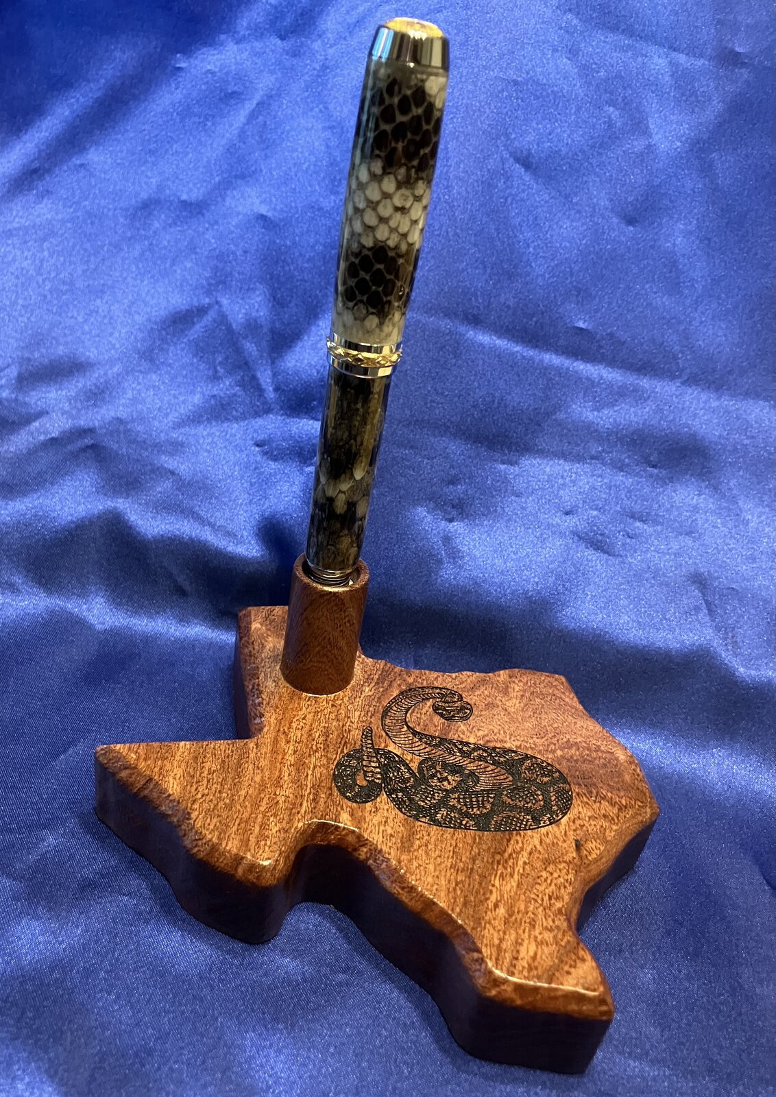 I made the pen a while back and I've debated keeping it or selling it. Now that I made a stand for it I'm going to keep it. The reason for not wanting to sell the pen is the cap. Rattlesnakes have a black and white banded tail. The cap circumference is large enough so it takes a pretty big snake to get a skin that will fit. So about the materials used. The snakeskin is a Western Diamondback Rattlesnake from Sweetwater Teas. The cap is the black and white banded tail and the pen is the diamond pattern from the back of the snake. The stand is Mesquite from South Texas. It was all made in North Central Texas. Ha Ha. Just thought I'd toss that in there. Any Questions or Comments Welcome.