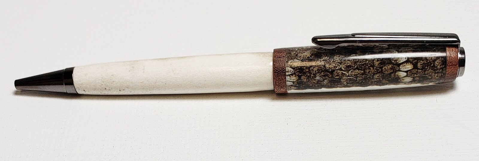 I call this pen the "Texas Trilogy" since the materials are Texas White Tail Deer Antler, Texas Western Diamondback Rattlesnake Skin, and Mesquite. Enjoy Do a good turn daily! Don