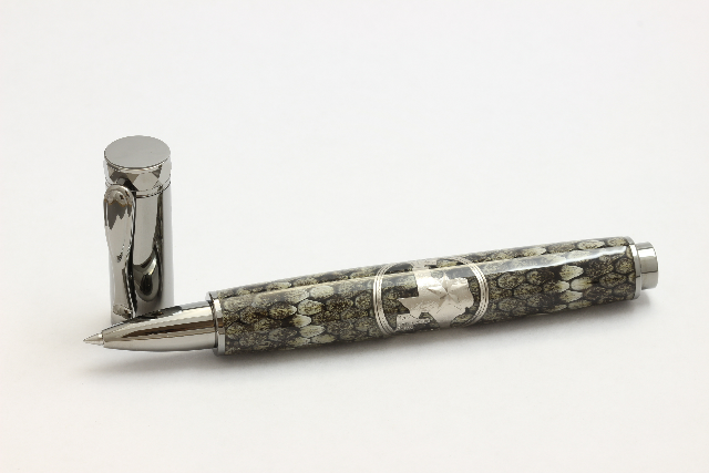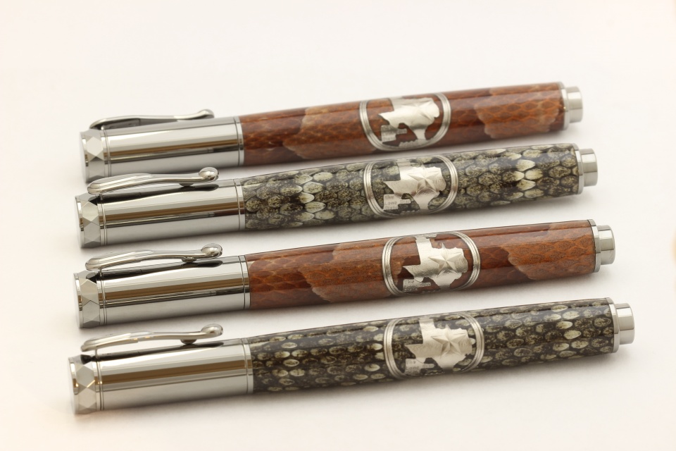 I was recently commissioned to make 4 rollerball pens for a friend of mine to be given to the groomsmen at his wedding. He requested that I make two using Western Diamondback snakeskin and two Copperhead snakeskin with my custom Texas Tru-Quarter™ design. Lucky for him, I had everything ready to start the production. So these are the outcome. Hope you all enjoy. Any comments or criticism VERY welcome.