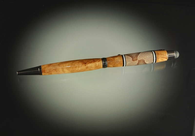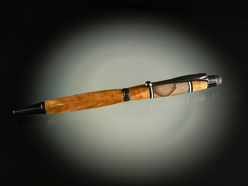 North Texas IAP got together on Saturday and I was the beneficiary of lots of good information, but more importantly, I traded a lowly piece of mesquite burl to my new pen buddy Kenny Durrant for his fine segmented casting featuring two Texas treasures, a dead copperhead and some cool post oak burl. I am not a wood expert, but I have been told that post oak burl is somewhat rare and with the work that Kenny put into creating the blank, I decided to upgrade this slim to a custom stylus combo. I don't like the stubby pen tip on the PSI combo, so I use a standard slim and add the PSI tapered replacement stylus on top. C&C, especially tips on how I can improve are always appreciated.