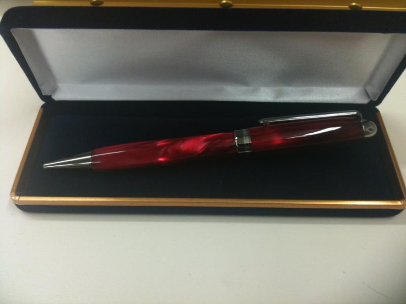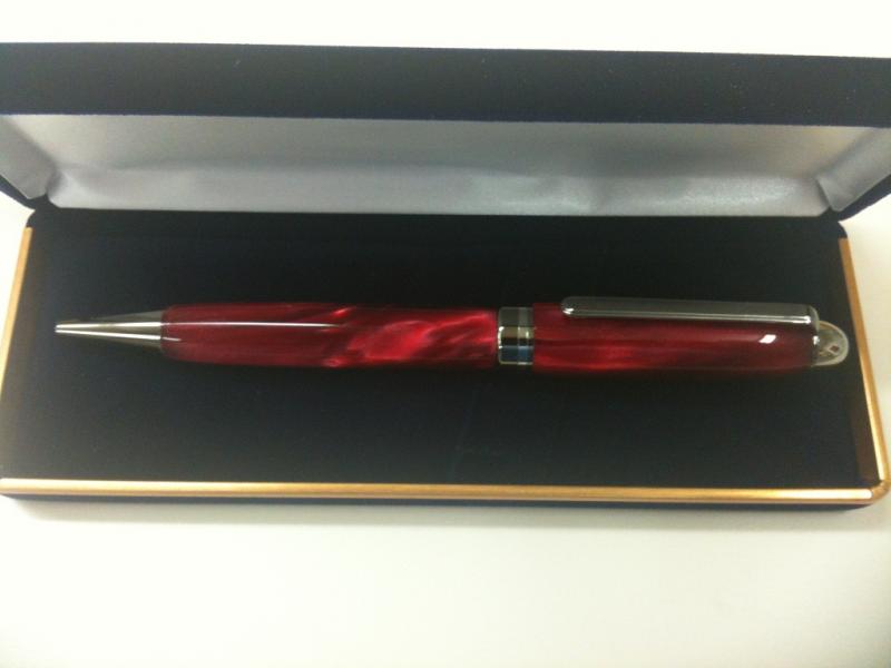 The blank is from Exoticblanks.com. It's Madreperlato-Cheery Red on a Black Titanium Euro kit. After turning this pen I'm hooked on synthetic blanks and will begin casting soon.