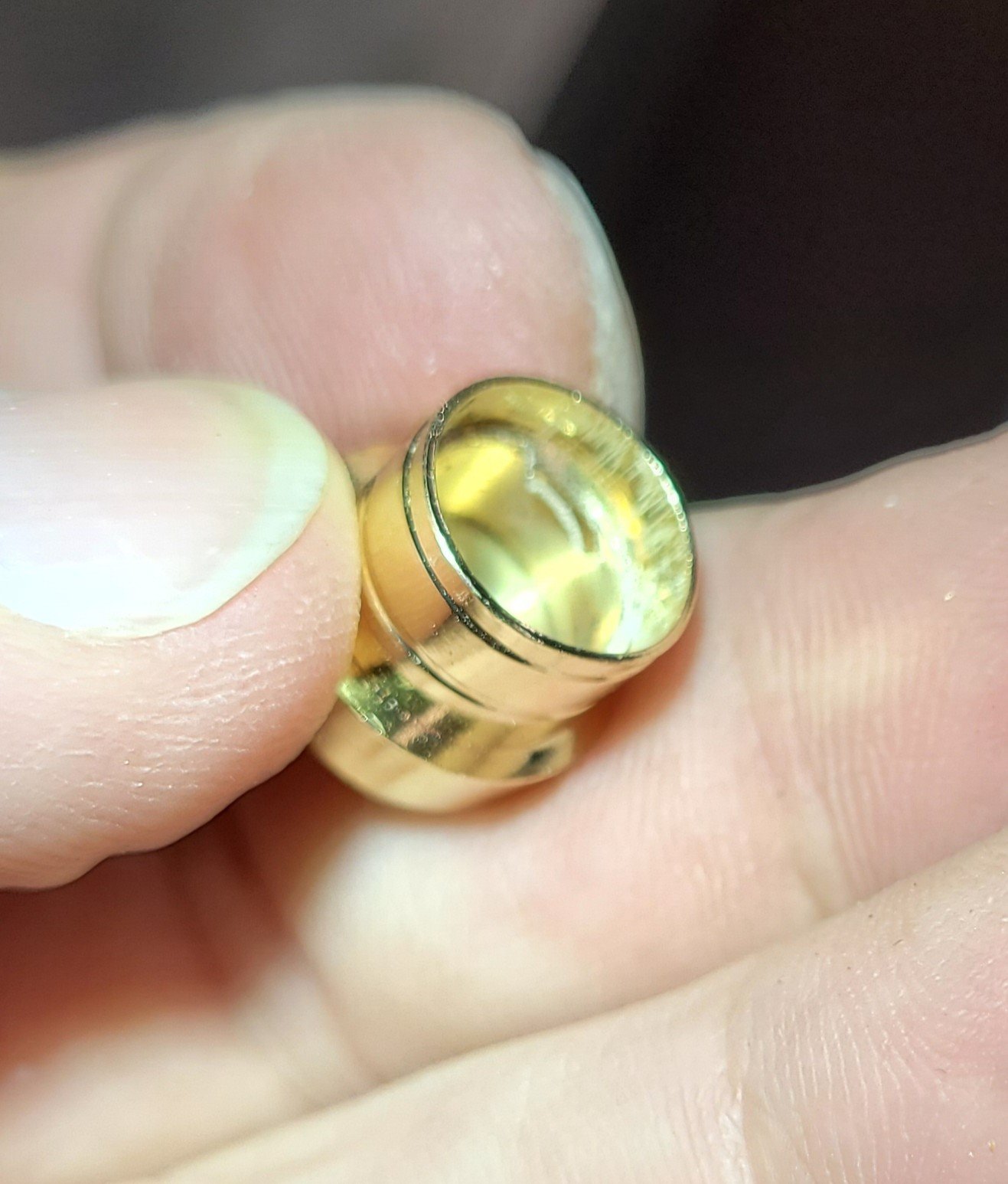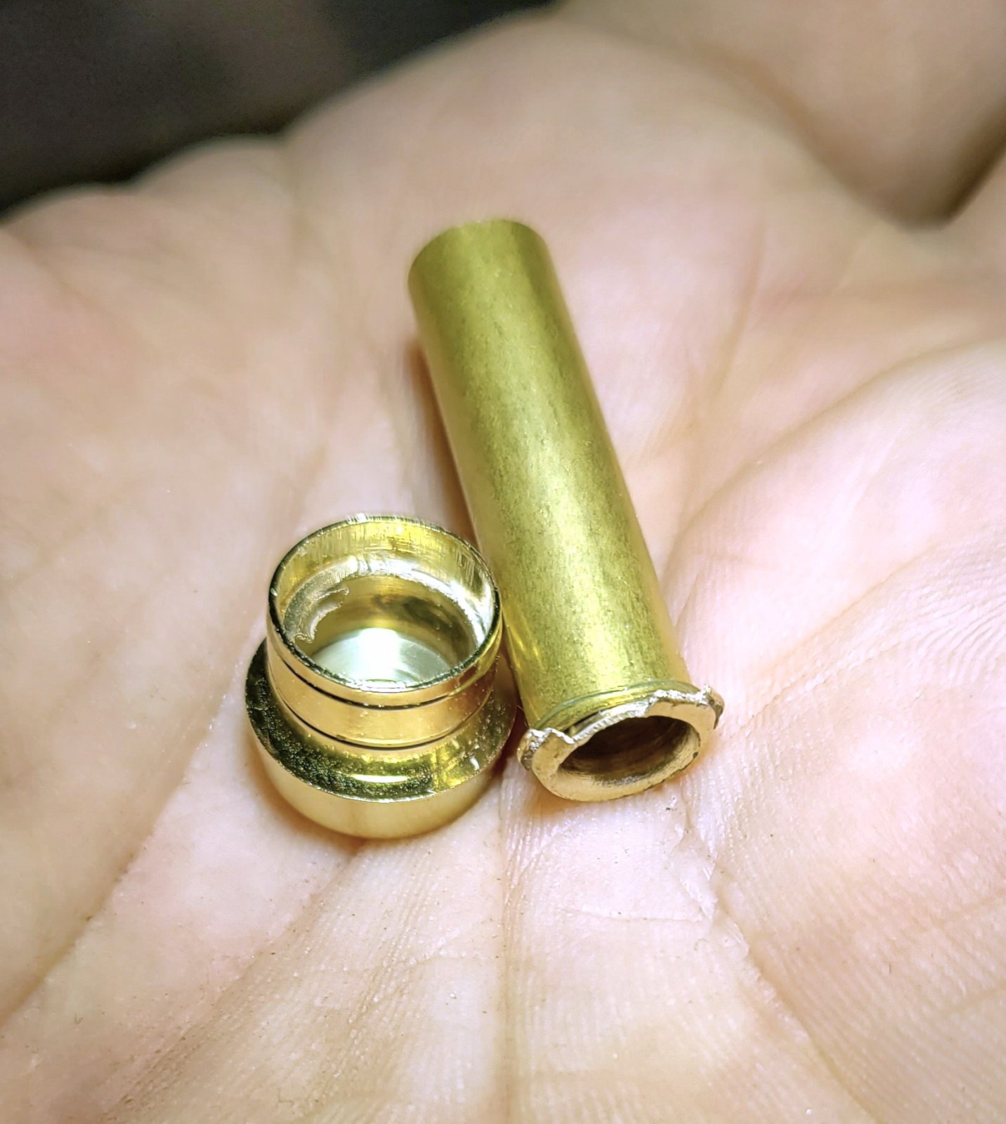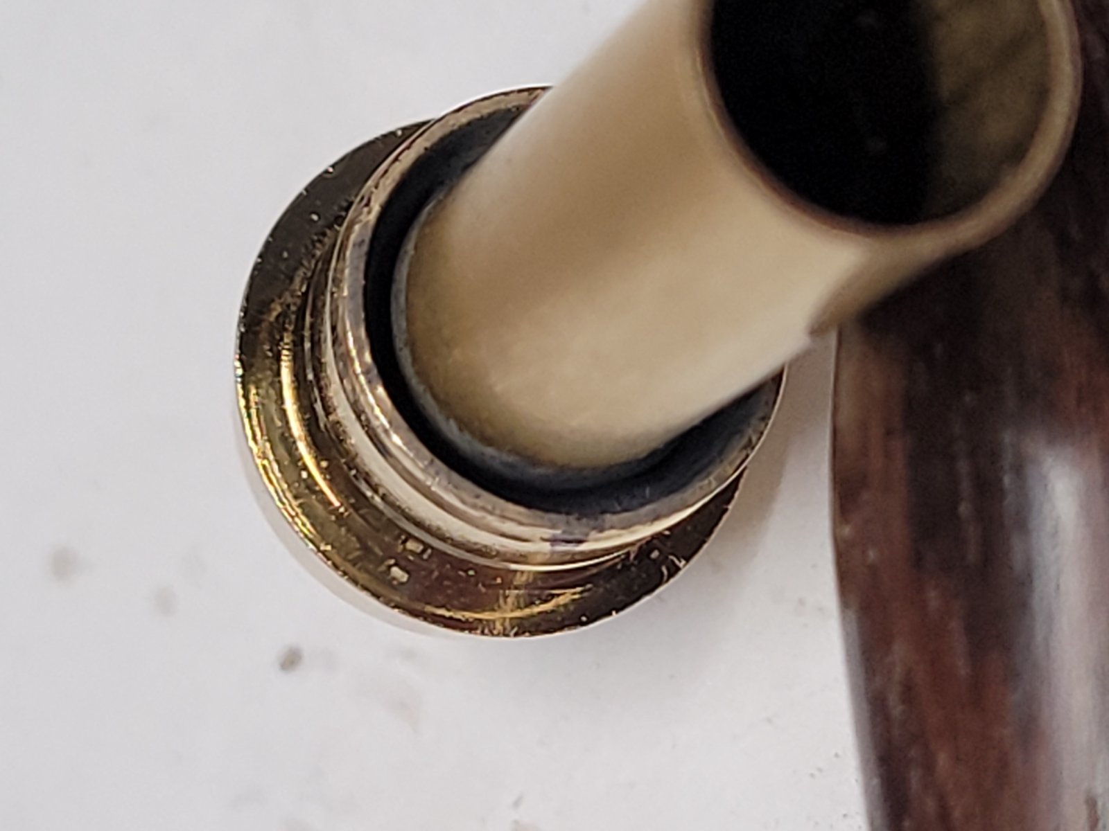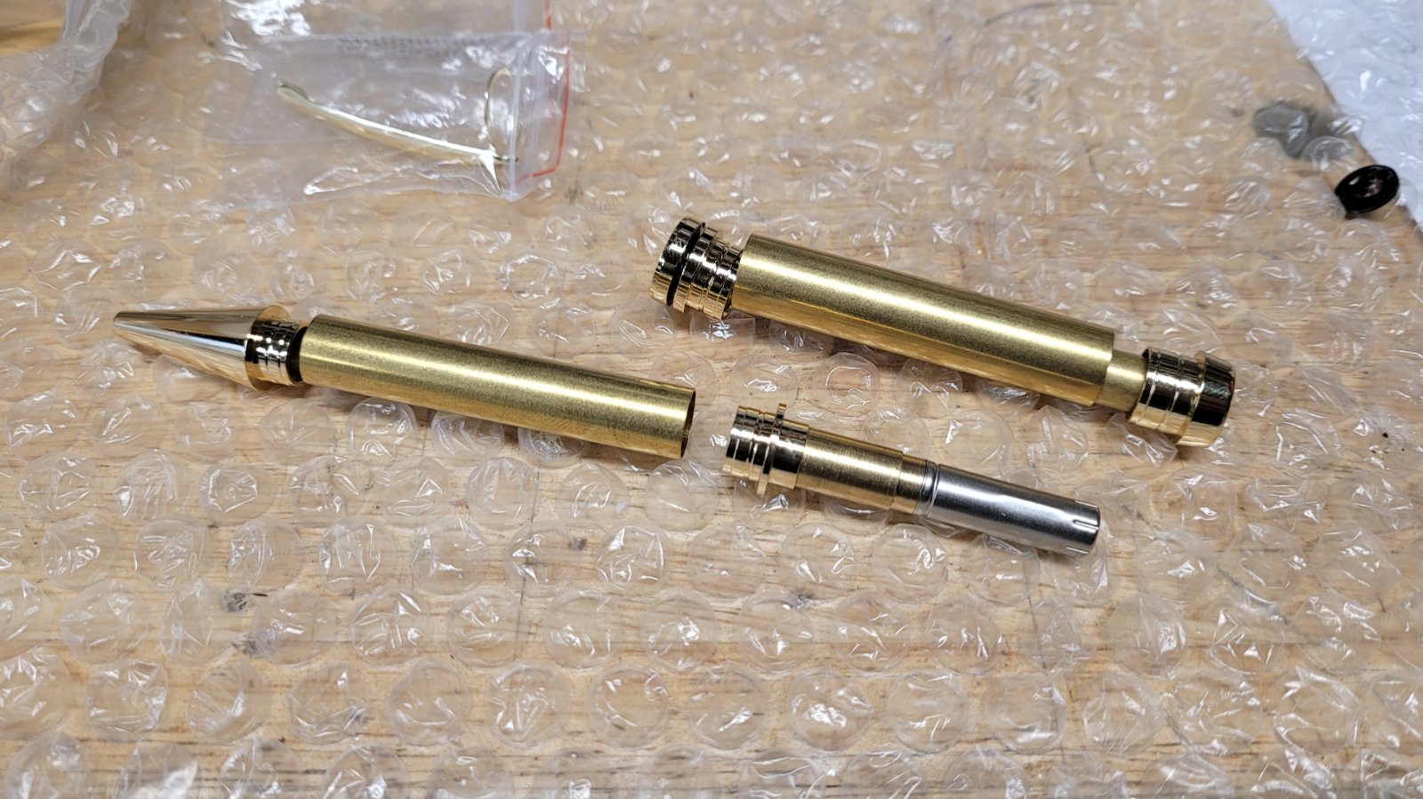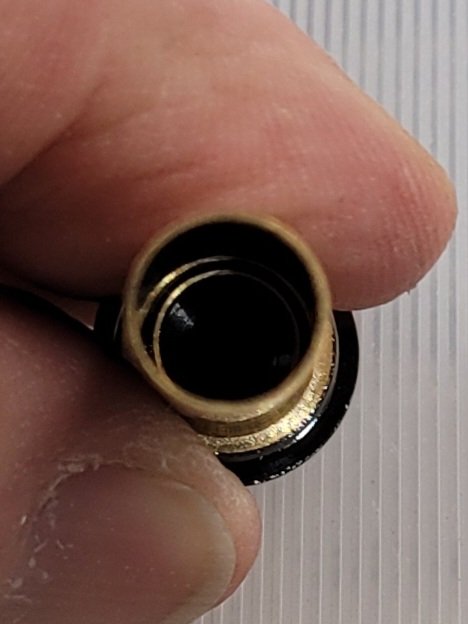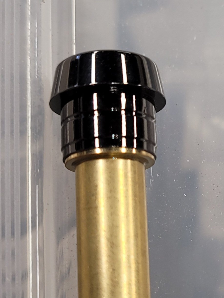 It looked like the finial would be easy enough to replace on this kit. I started to drive the kit finial out with a transfer punch sized to fit the tube without realizing that there is another concentric tube inside the assembly that grips the twist mechanism. I proceeded to pretty much destroy that, but was able to clean it up with a Dremel and "glue" it together with some JB Weld. Here's the story in pictures. So, if you are going to knock out the finial out of a Wingman kit (I got this from Turner's Warehouse), make sure you use a punch that fits inside the inner tube of the finial assembly!