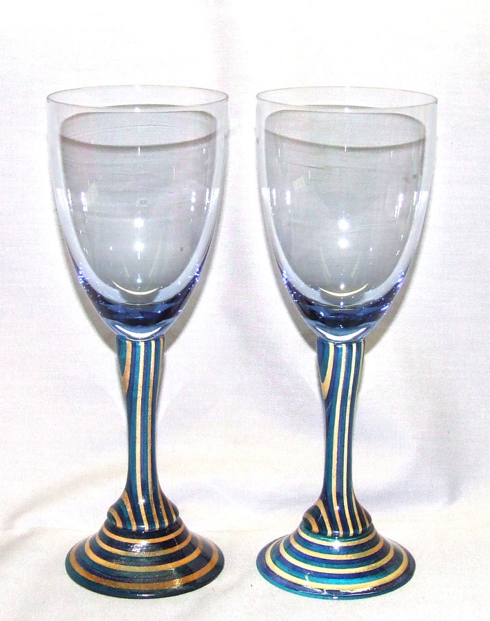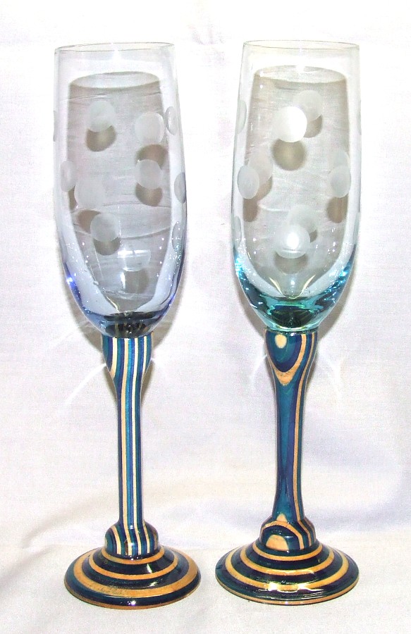 The spotted champagne flutes threw me for a bit... when I picked them up I thought they were the same set of glasses, but one turns out to be blue and the other a greenish color... I'll sell them as his & hers toasting glasses... wedding glasses .... they're 10 1/2 inches tall, on Spectraply "Caribbean Wave" pattern... blue, natural and turquoise... finished in polyurethane.