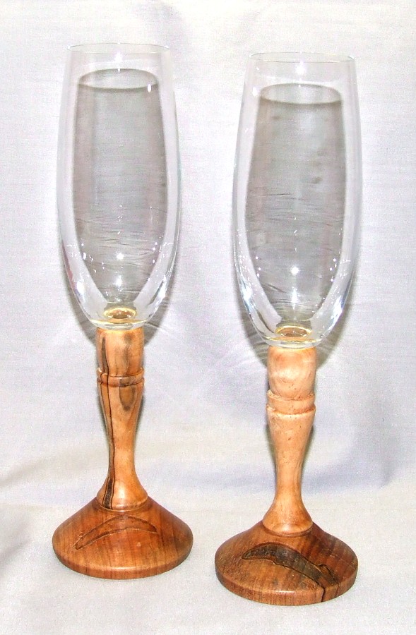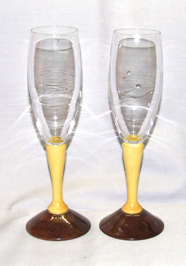 The smaller champagne flutes with the yellowheart and pau santos stems are 8 1/2 inches tall and also finished in polyurethane.