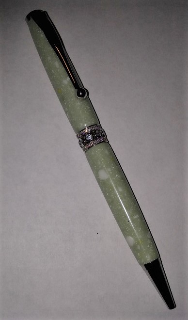 I try and pick a different style of pen to turn each year for gifts around Christmas time. My wife, who is also my best customer since I only give away my pens, always asks me to turn a slimline in Corian for her. It doesn't matter how fancy or expensive the kits are for that year or how exotic the blanks, Buckeye or Ambonia burl, nope, it doesn't matter, she likes the slimline with Corian. I found these fancy center-bands on Ebay and I figured I'd give them a try. I was pleasantly surprised at the detail when they came in so I decided to name this one, the Blingline .