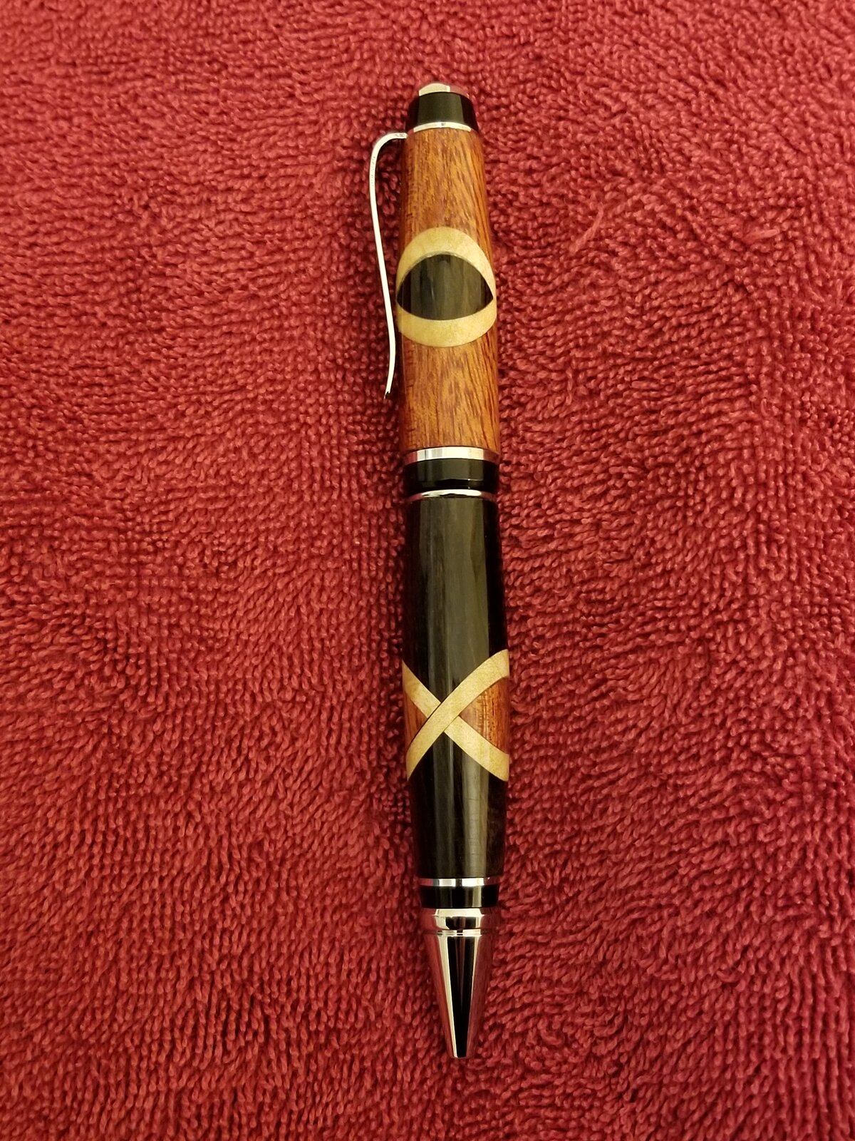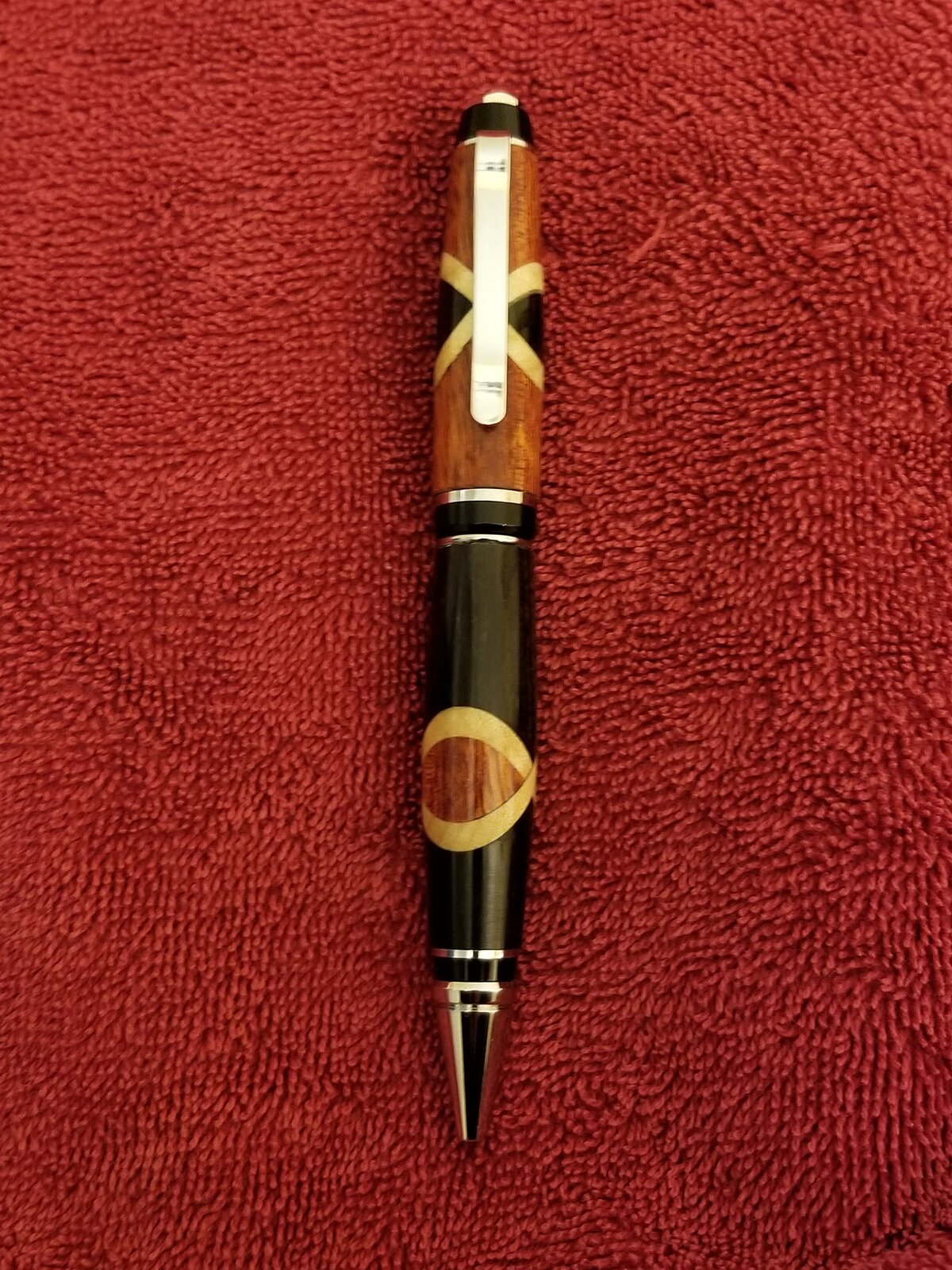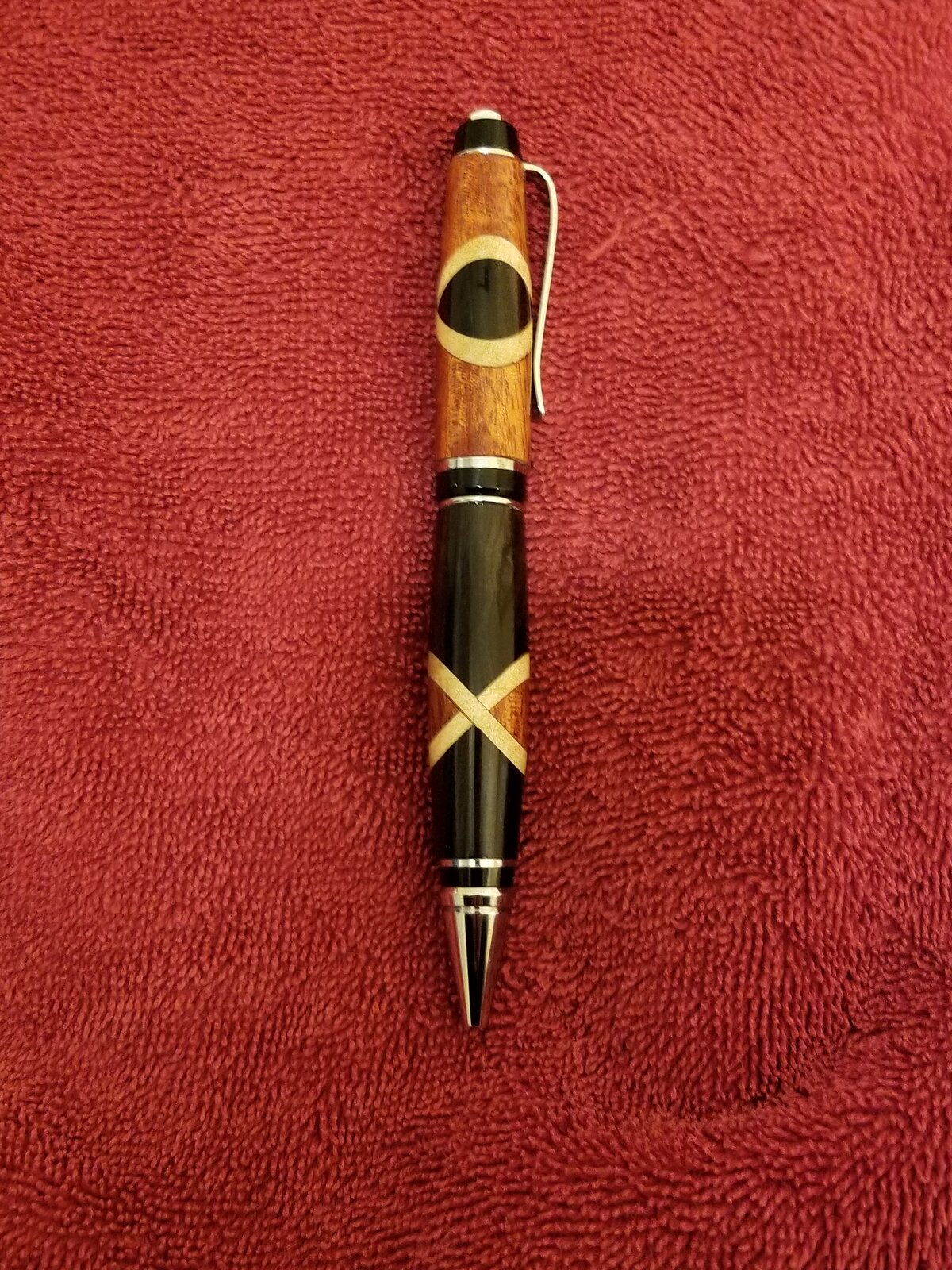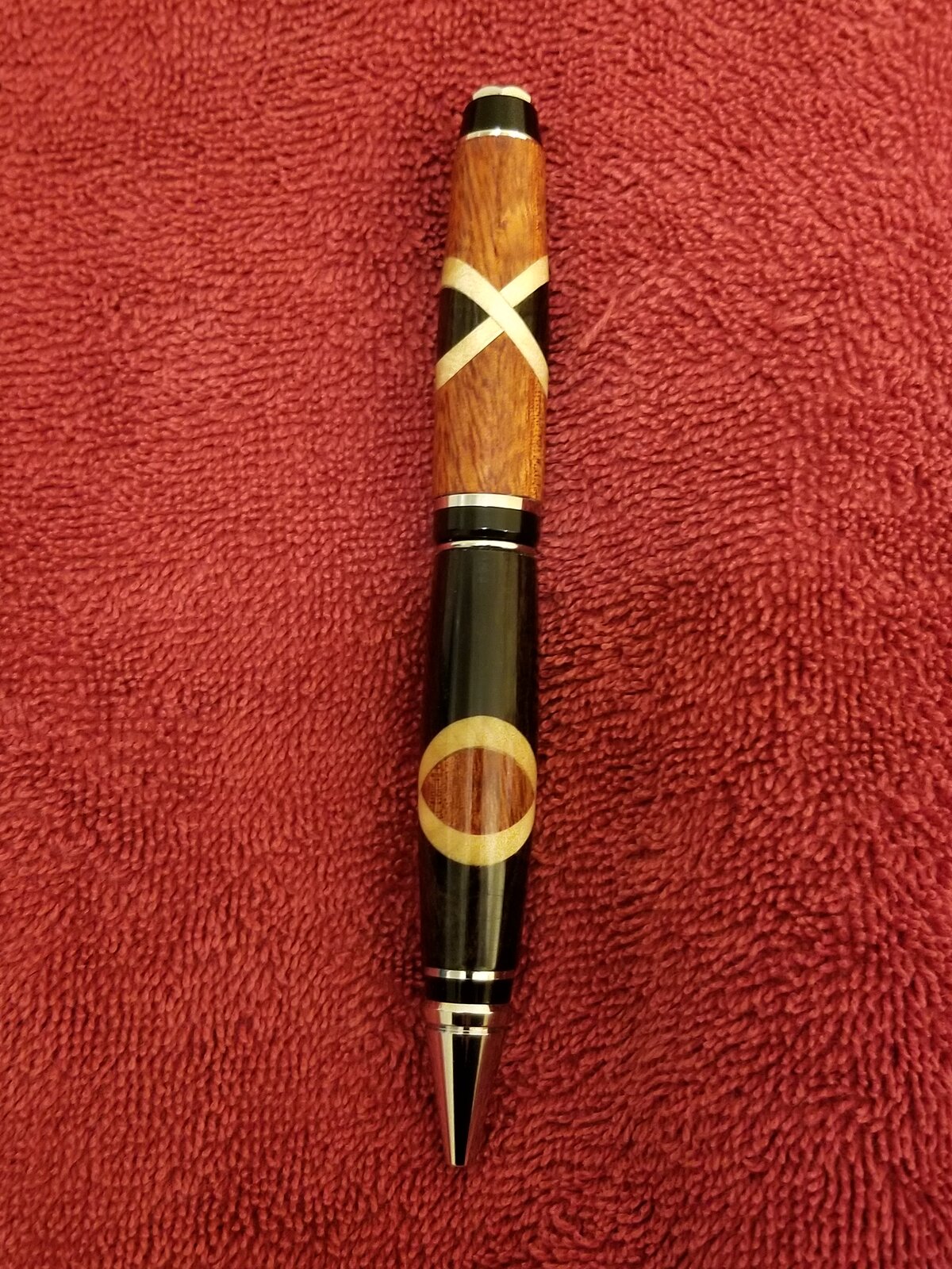 So these are halfknots. I thought it might be easier to match. They are cut through. As you can see the bottom lines up better than the top. The top I used a 90* L straightedge to glue. The bottom I just eyeballed both sides. I think that would be harder to do with 4 cuts. Woods are African Blackwood, paduk and curly hard maple. No sanding before the CA because that blackwood dust would ruin the other two colors. This pen isn't perfect but I learned more. And I think the colors are striking.