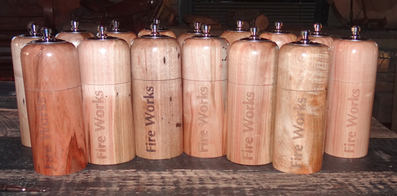A few weeks ago I got an email from the manager of an upscale pizza joint in Arlington, Virginia (I'm near Lexington, Kentucky so he somehow ran across my web page) asking if I could do 50 salt shaker/pepper mill combo units for him. He sent me the design that he wanted (not all that dynamic but the customer gets what the customer wants), decided on the wood (ambrosia maple) and we agreed to start off with 15 and if he liked them we would move forward with the rest. When the guy said he wanted them etched with the restaurant name he said, "maybe that will keep people from stealing them," I chuckled and said, "or their friends will know where they stole them from!" (I'm thinking this will be a perpetual job replacing the mills that go missing).