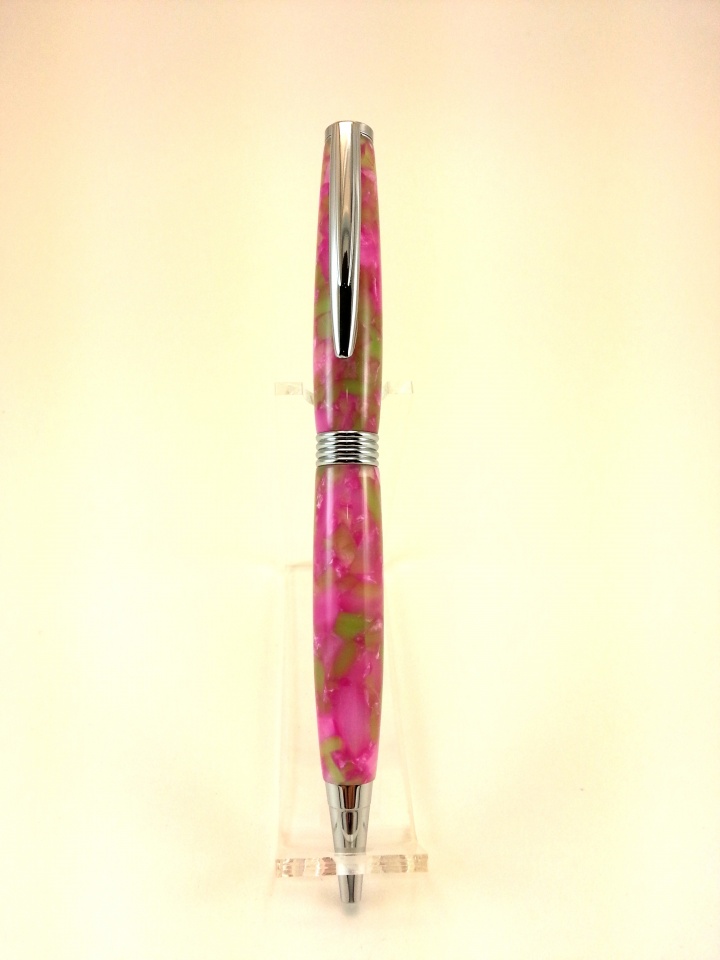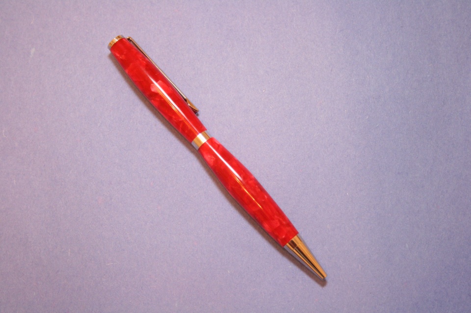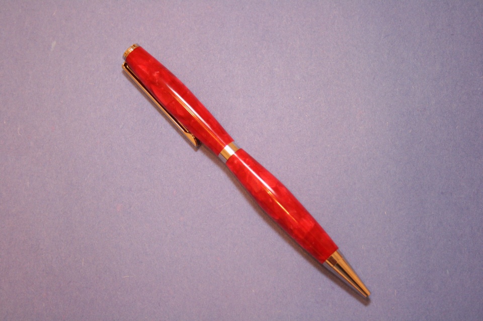 Here is platinum slimline dressed in a red acrylic blank. Evelyn ask me to make this for someone who has been very helpful finding some information she needed to help a client. I did paint the brass tubes red as I did not want to take a chance the brass would show through. IMHO the red and platinum are a great pairing. All C & C are welcome.