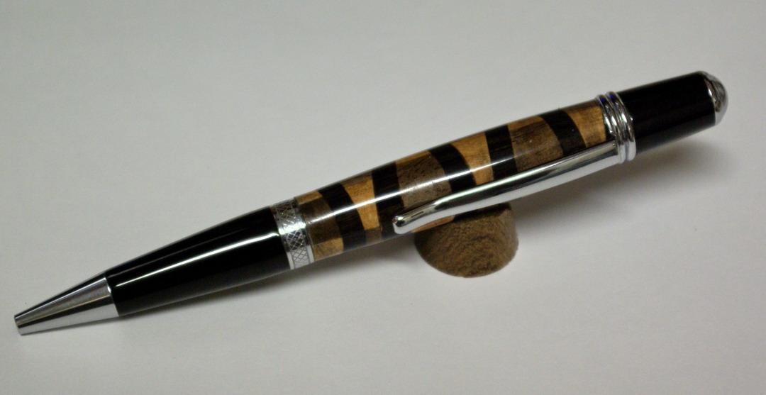 This is my first "The Morning After" pen following Ron McIntire's tutorial. It was a learning experience - pieces flew everywhere and I got glue all over my fingers. Great tutorial but I experienced a learning curve. I think my next will come out better. I made this pen using walnut, cherry and African black wood. Comments are always welcome.
