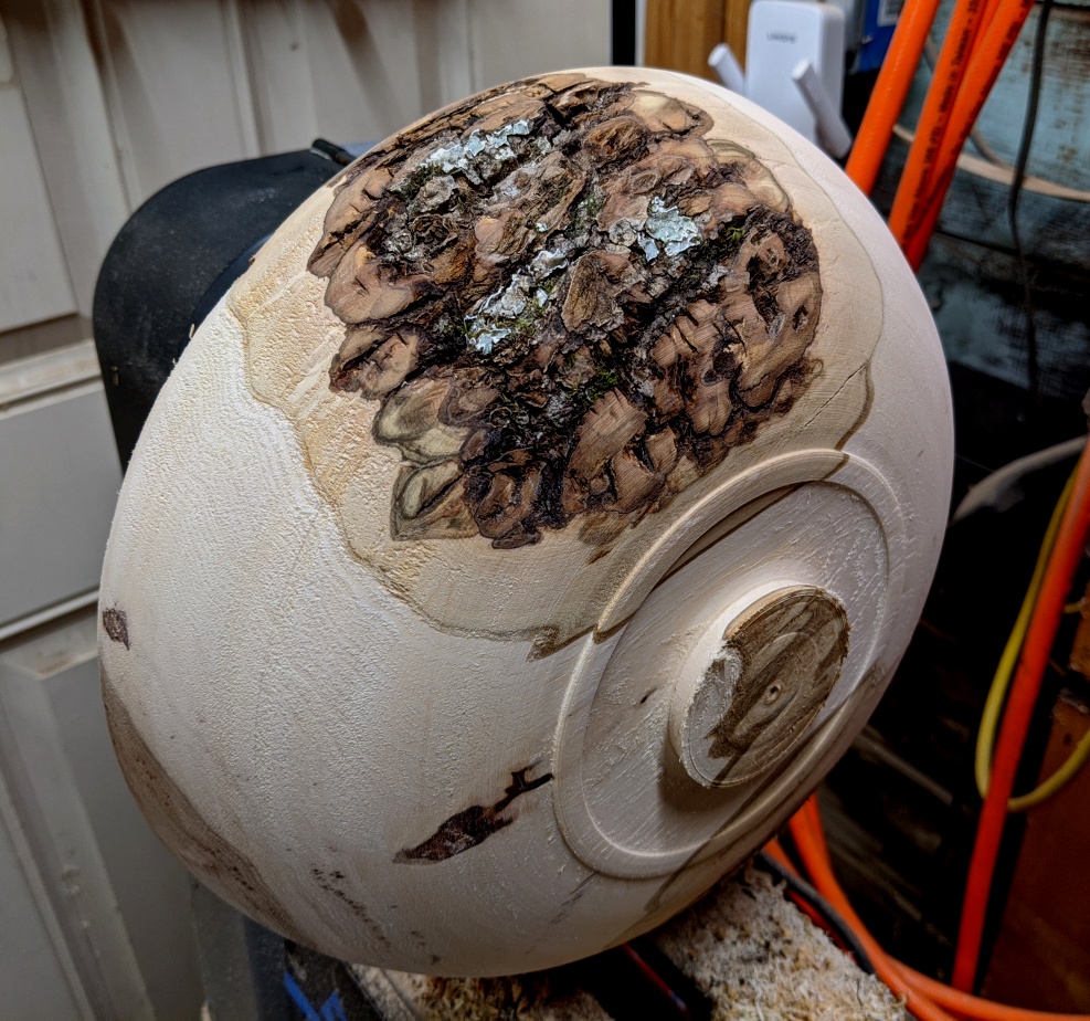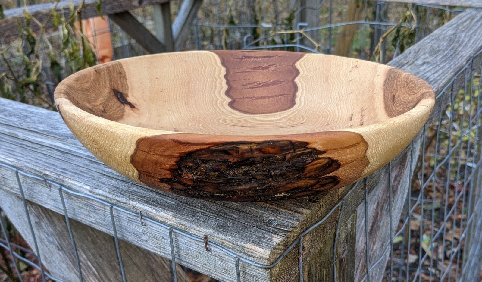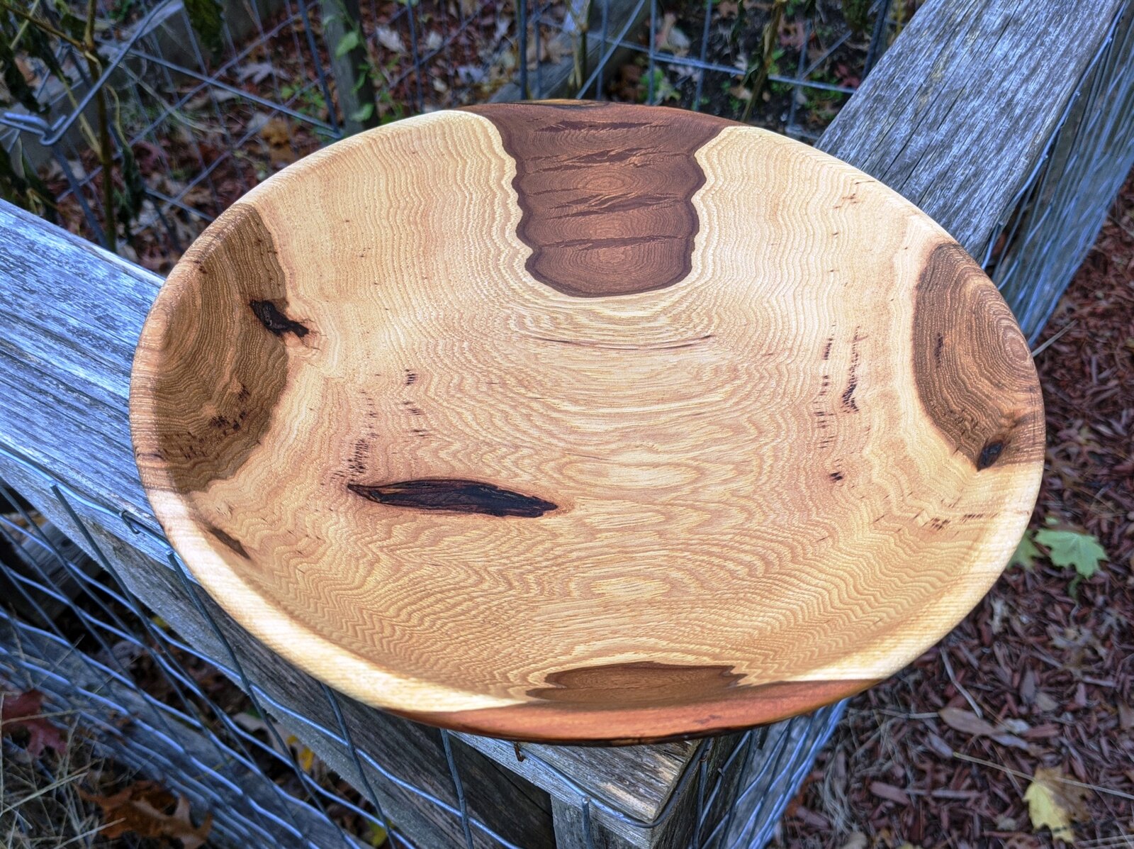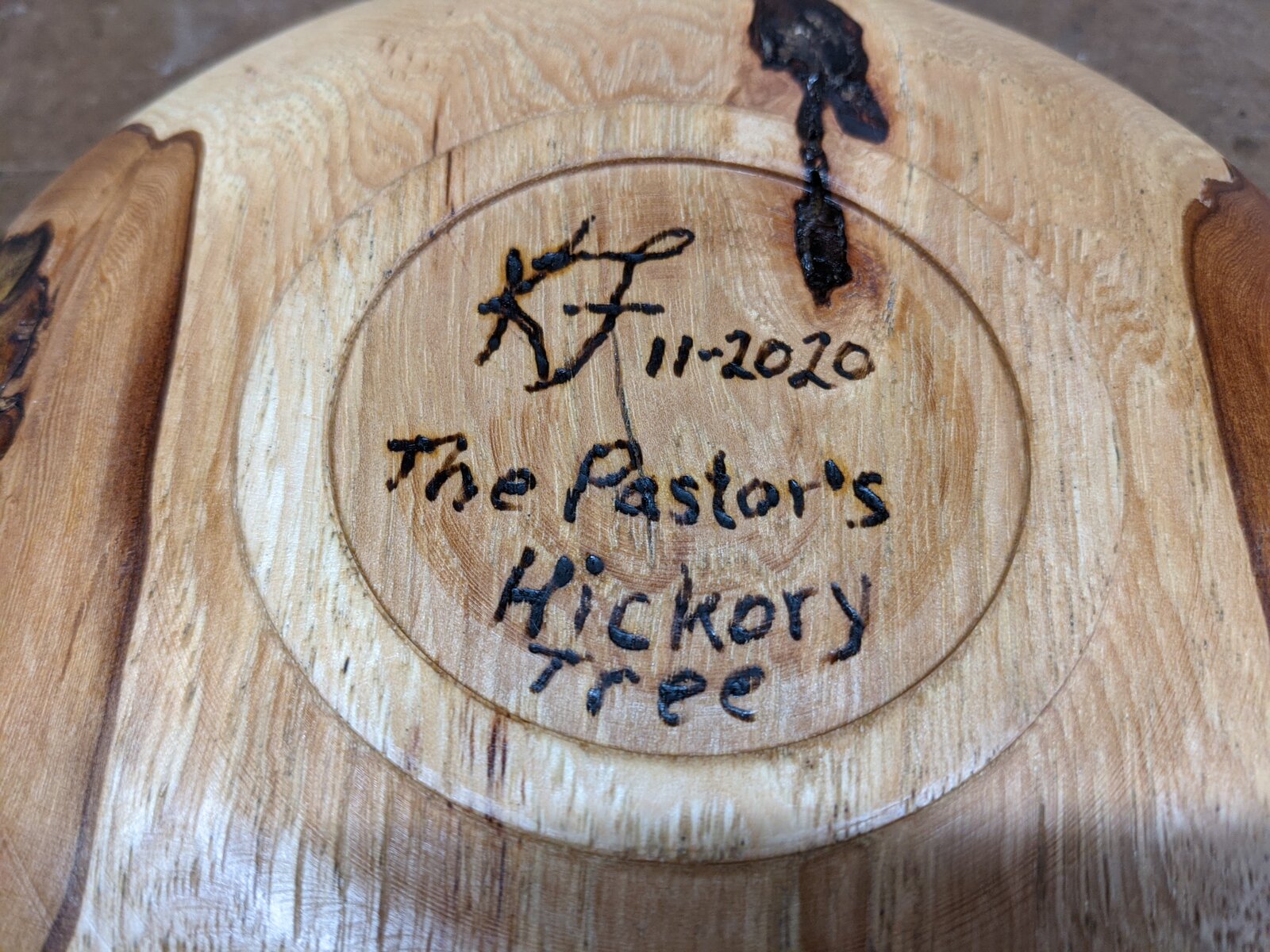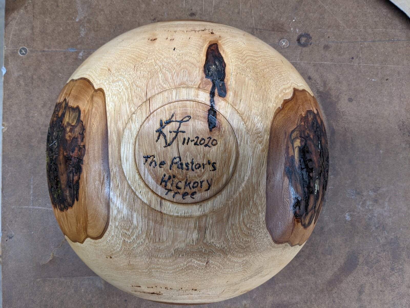 Long story short, I cut the log up and Anchorsealed the end grain and stored it all in the shop. I took one blank and roughed it out for a bowl green, stored it for a couple months in its shavings in a plastic bag. I took the blank and threw in my stabilizing oven and dried it out and finished turning it. When it was all done and food safe finished I presented it to the Pastor and his wife. they were amazed, very surprised and his wife told me she was saying they should have had something done with the tree as a memento. When I handed the finished bowl to them they were teary eyed.