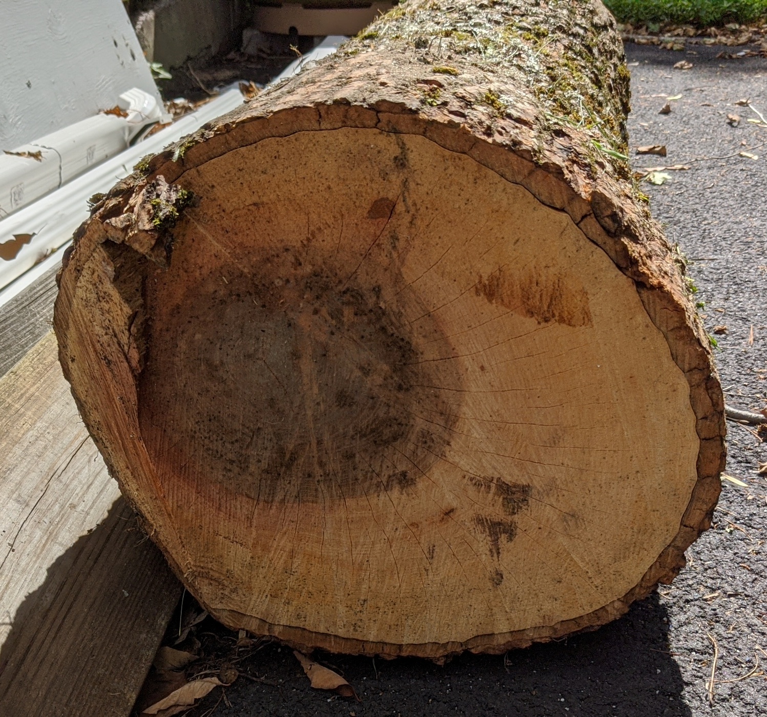 During the last high wind storm, the Pastor of a local church that lives down the street from me had a Hickory tree that was compromised and had to be cut down. I noticed the wood logs laying in his side yard and inquired as to what he was going to do with it all. These logs varied in diameter from 24" x 8', 14" x 5' and smaller/longer. He mentioned that the larger log was claimed by the guy that cut the tree down but the others he didnt have any plans for. I was given permission to take the 14" x 5' log.