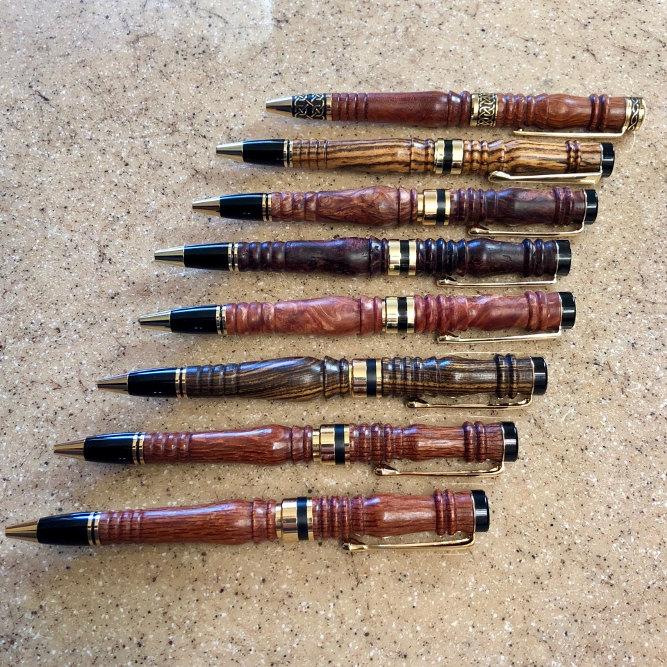 After some work and research, I was able to recreate the design and with the exception of the band, we decided to go with the Classic Twist 24kt Gold pen with various hardwoods.
