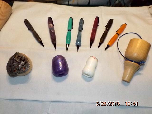 There are a couple of other items with the pens but I'm no photographer so these pictures are not great. Some of the pens are not either but the big fat one is my favorite one. I can hold it with no problems and I like the pearlescent look in the blanks. It doesn't show up too well in the pictures and I'm coming up with other ideas on the casting. Enjoy! Fay Oh the other items are a ball and cup game and 2 kaleidoscopes and the box with a heart shaped lid. I just have to order kits for the kaleidoscopes