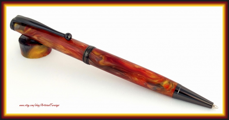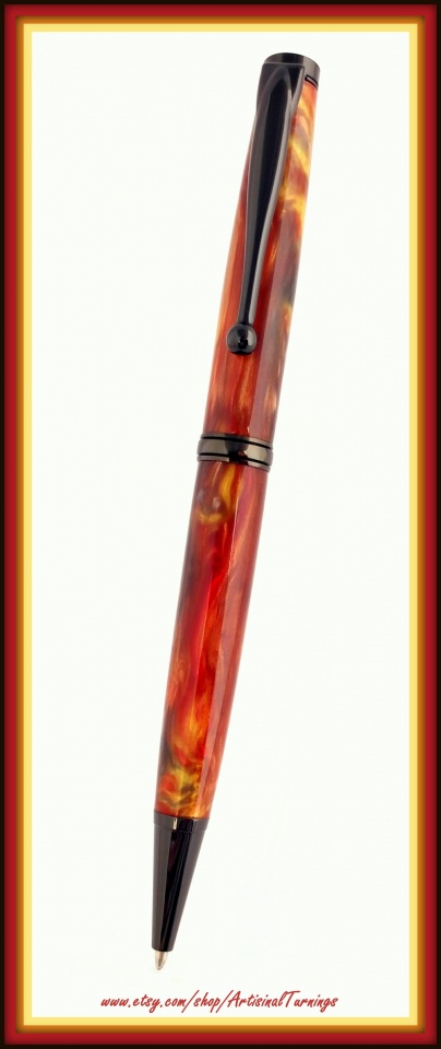 Here are my entries. I cast the "Hell's Fire" blank on the Slimline using PR. The other Slimline is Ebony and dyed, spalted, quilted maple blank. I used red and black Alumilite dye in Cactus Juice. By the way, I use a brake bleeder pump and a mason jar to stabilize and dye my blanks. I've only just started experimenting with the process and it works reasonably well. I did drill a 1/4" hole in the pen blank to help get dye into the interior of the blank. Thanks for looking at the blanks!