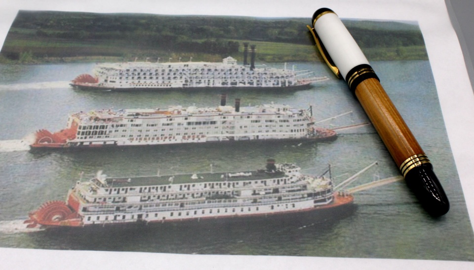 This is a special pen I've just finished that will be a surprise gift for my retired brother-in-law who, as he says, was "blessed enough" to serve as both Pilot Captain and Master on all three Queens of the Delta Steamboat Company: the Delta Queen, the Mississippi Queen, and the American Queen. The three Queens were all true steam-powered sternwheelers, although the American Queen (still in operation) also has auxiliary diesel-electric Z-drive pods to aid in maneuvering in tight quarters.