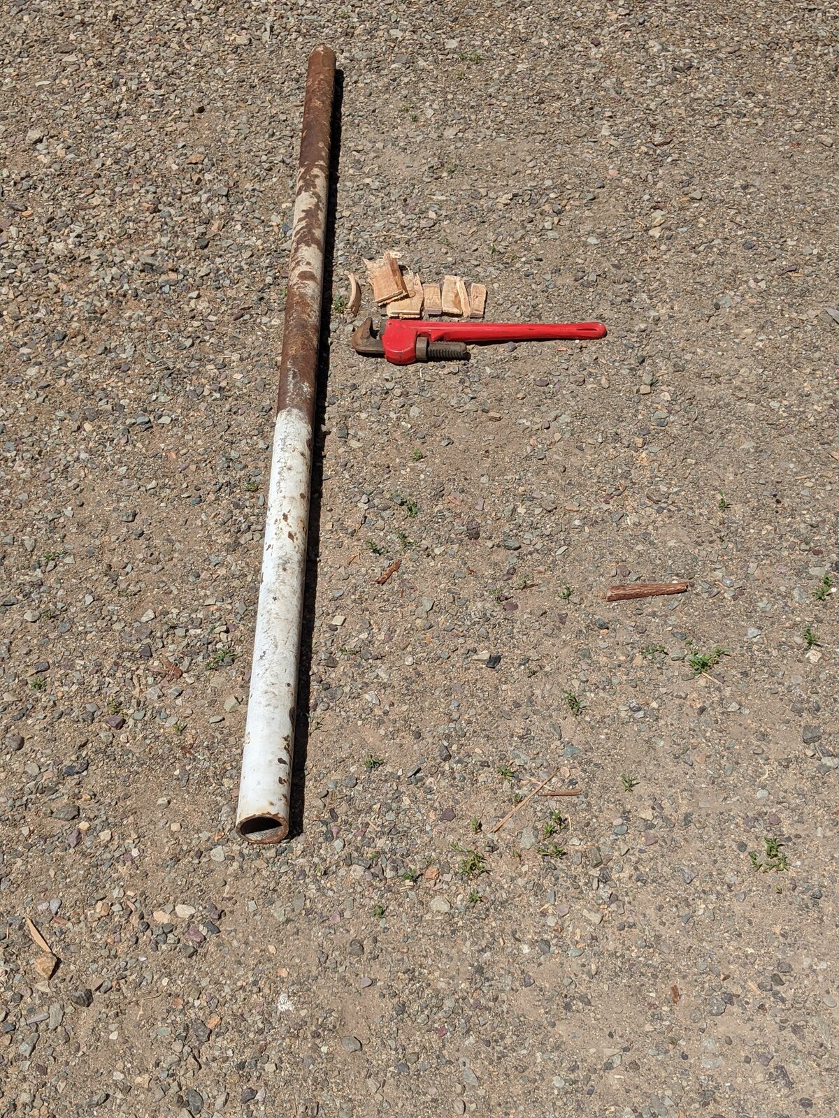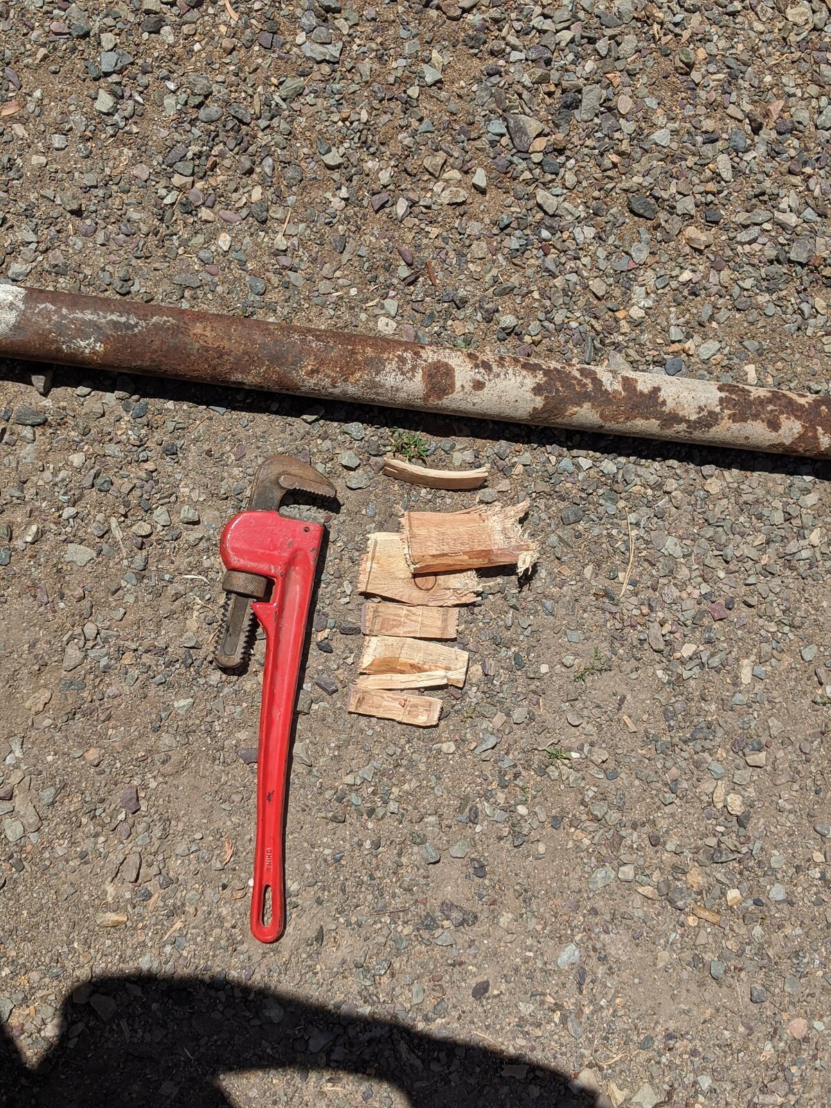 A couple of weeks back I posted a thread here about my wood chipper that was stuck. Well, we got her fixed yesterday but it took some time and a lot of effort (and so not nice words). Here's what it took shown in the photos which does not include the hundreds of other tools we used. We were just about ready to get the thing loaded on the trailer when my daughter commented she knew where a big cheater pipe was. My wife and daughter took the UTV down to the wood lot and brought it back, stuck it on the end of a 16" pipe wrench and after a bit of coaxing the pieces final broke loose and came out. Take a look at the pipe wrench, the handle used to be straight. The pieces of wood were compressed to maybe 3/8" thick.