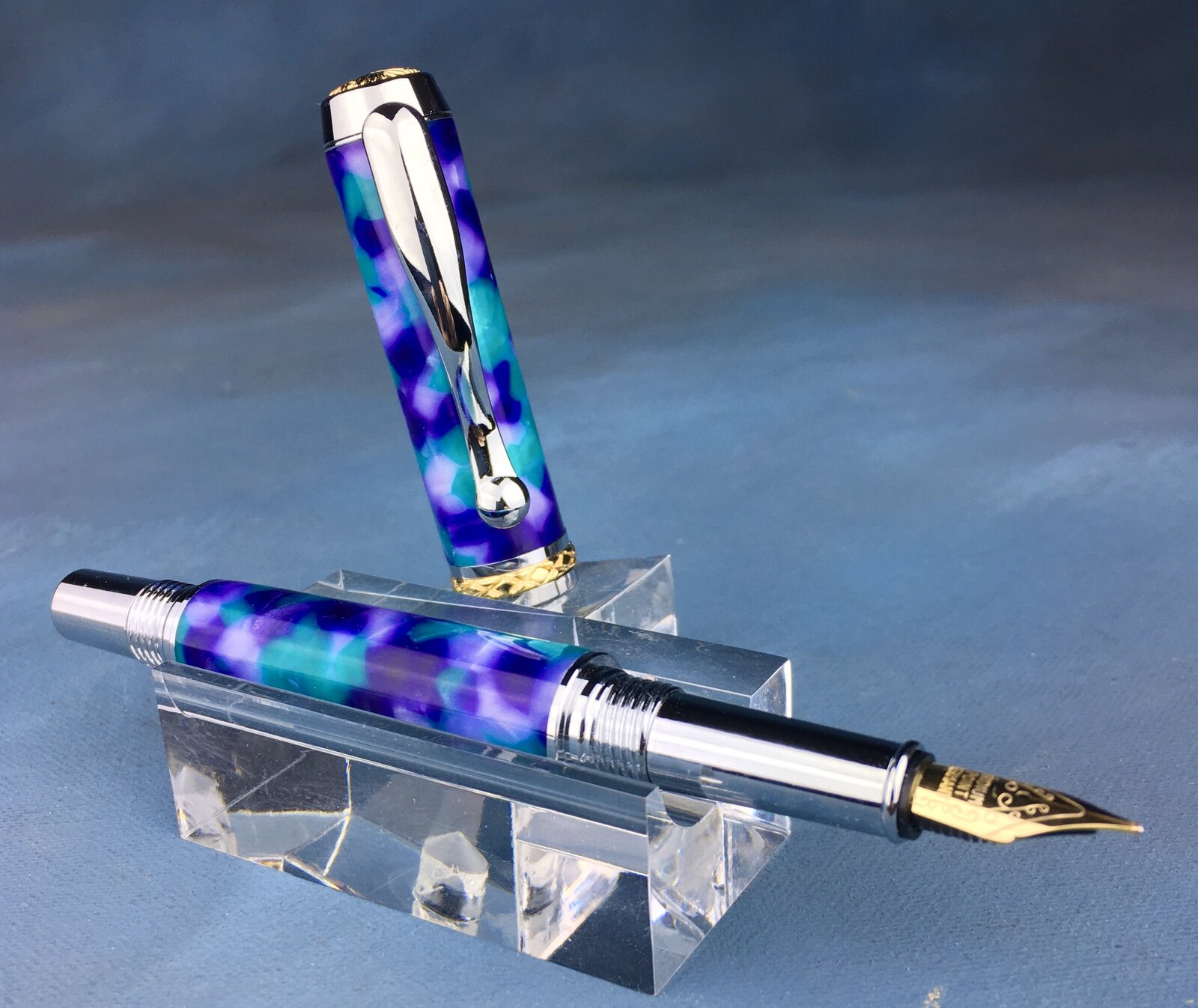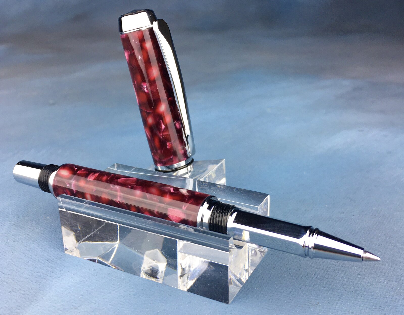After a week or so of replenishing shave sets, bottle stoppers and other items, it was a treat indeed to work on some more expensive pens. You may only make high end pens so you might get this thrill all the time, but I relish it. Here are two finished today, both "Conway Colors": Triton convertible with Azure Italian acrylic and a Baron rollerball in Vintage port Italian acrylic.