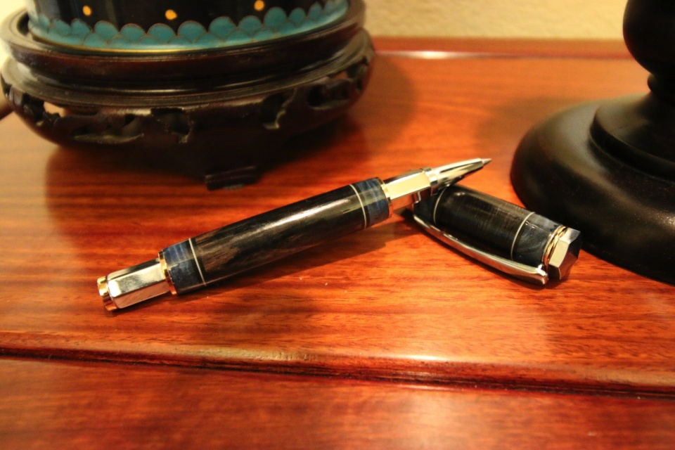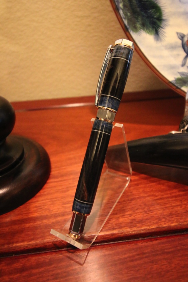 I made this pen as part of the Lynn Lacey Pen Swap for 2018. It is a Penn State Industries Vertex Supreme. The blank is a segmented blank that I made using Grey Dyed Tiger Oak, Blue Dyed Maple, and Black and White plastic sheets that were about .025" thick.