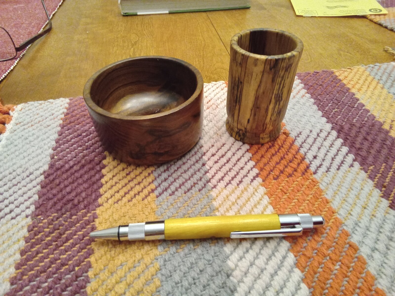 Today I did this nice little bowl of coffee wood, a small pen holder (not sure of the type ... ditchwood with some beautiful spalting) and an Osage orange Stratus. Also built a drying kiln so we'll have to see how that goes.