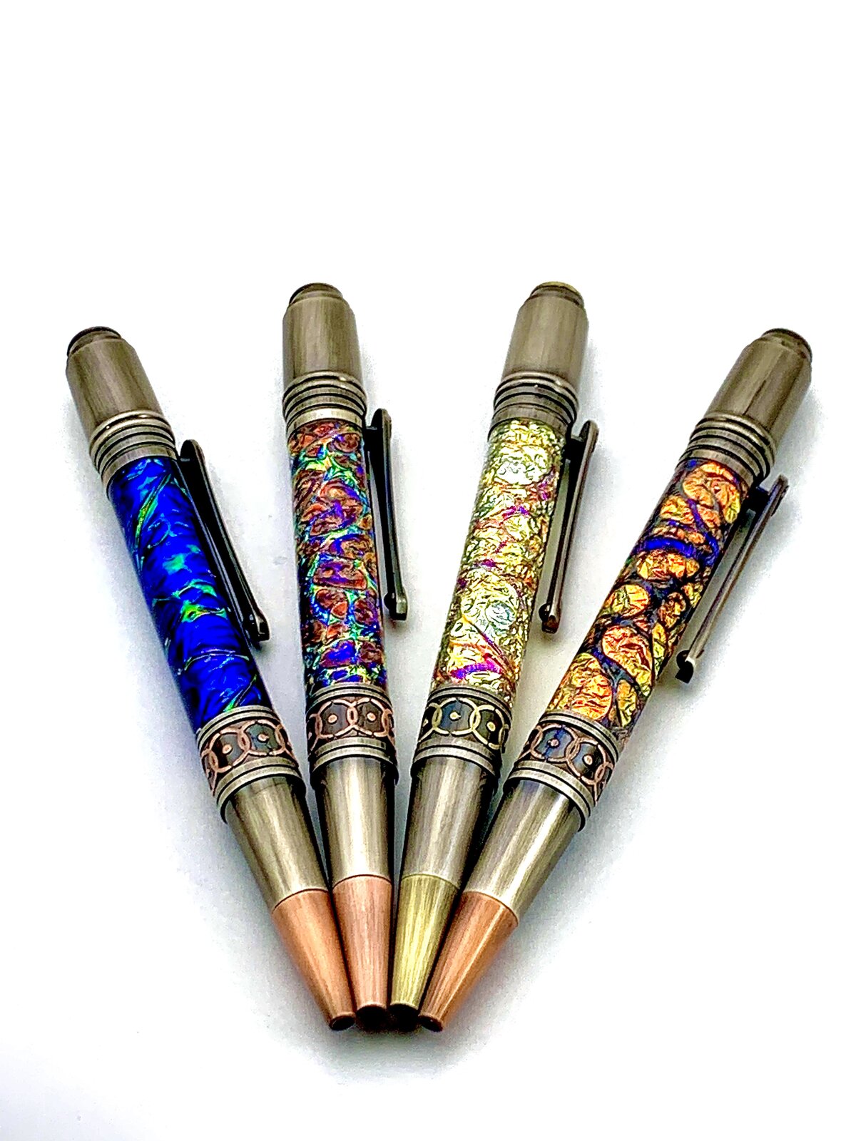 I made the blanks using "Tube-in", aka, "Pre-tubed" techniques. The media is called Dichrolam. It comes as a very thin (.017") pre-lam material that can be wrapped around a tube and the pressure cast. I have no idea what chemistry is involved to get such spectacular color, but it's pretty amazing in my book!How did you get the colors to keep from blending in so well? Particularly, the orange with purple.