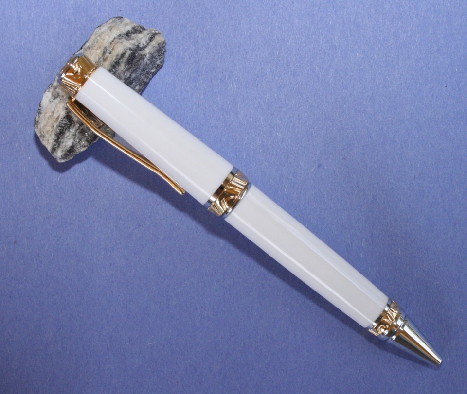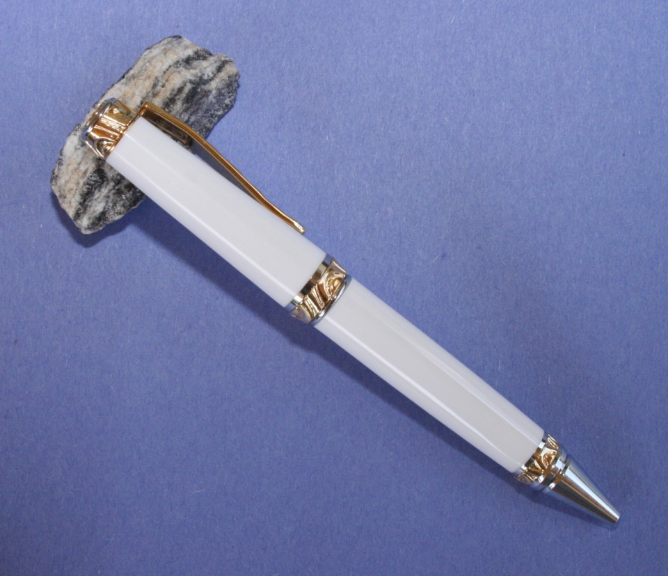 The Inspiration for this pen came from Eamonn (Silver) and this pure white pen. This is a Woodcraft Ultra Cigar Gold with chrome accents dress in a white corian blank I got on ebay. I wet sanded to 12000 mm and polished with Hut Plastic Polish. All C&C are welcome. Thanks for taking the time to look.