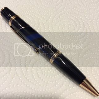 Finally tried a different version of a Thin Blue Line. Made with black wood on the ends, .016" copper plate, black plastic and blue plastic. The cross cut is 30 degrees and centered. I think I like the way it turned out and it seems to go on the gold and black Gatsby well. Feel free to add your advice, I'm learning.