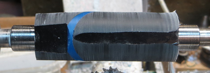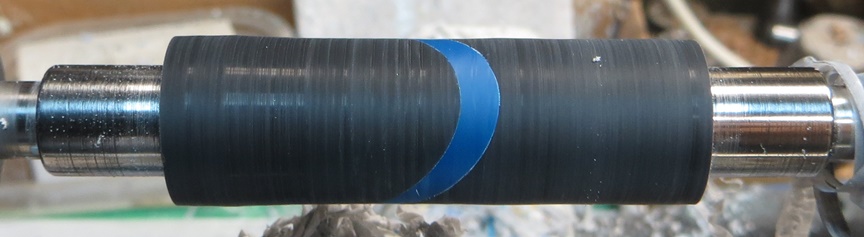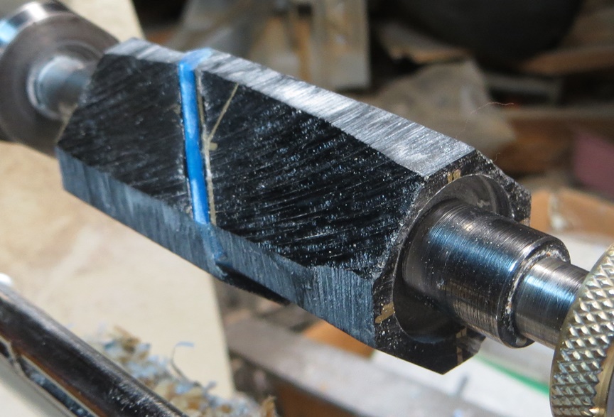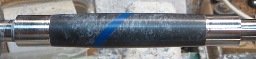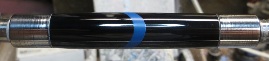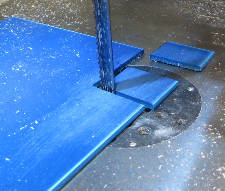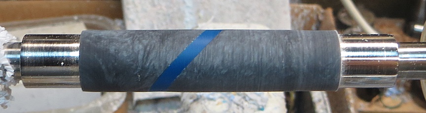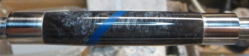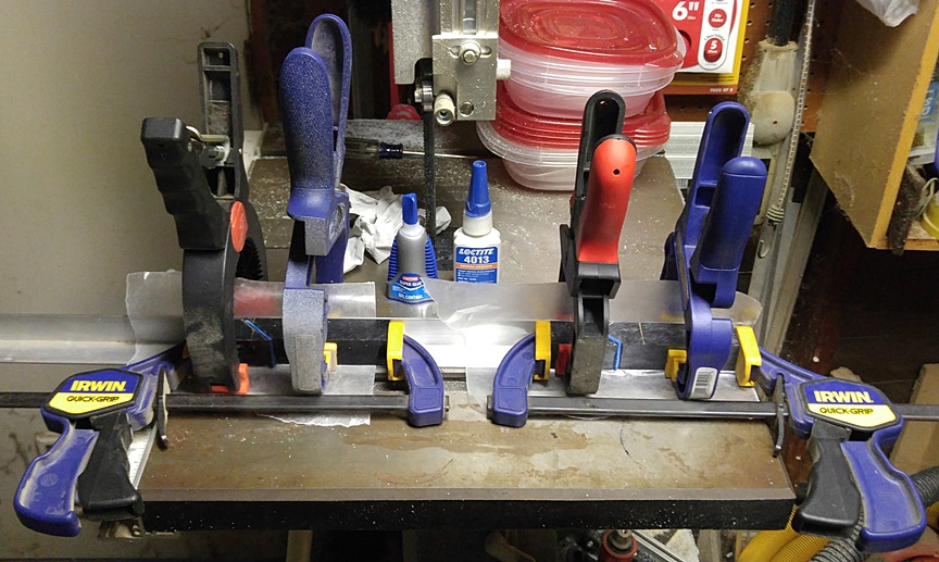 I've never segmented acrylic before, and I have to say I didn't have much expectation for success. The blanks looked pretty dicey after they were drilled and trimmed. I used a piece of aluminum angle, waxed paper, and clamps to hold everything together. The blue is 0.10" pick guard material that I got off Ebay. The glue is medium CA. I cut the blanks at 45 degrees on my miter saw.
