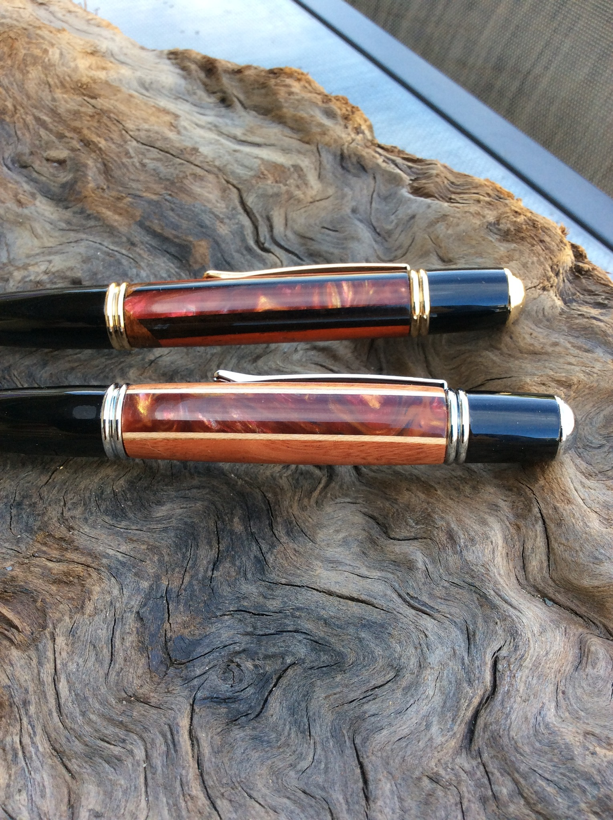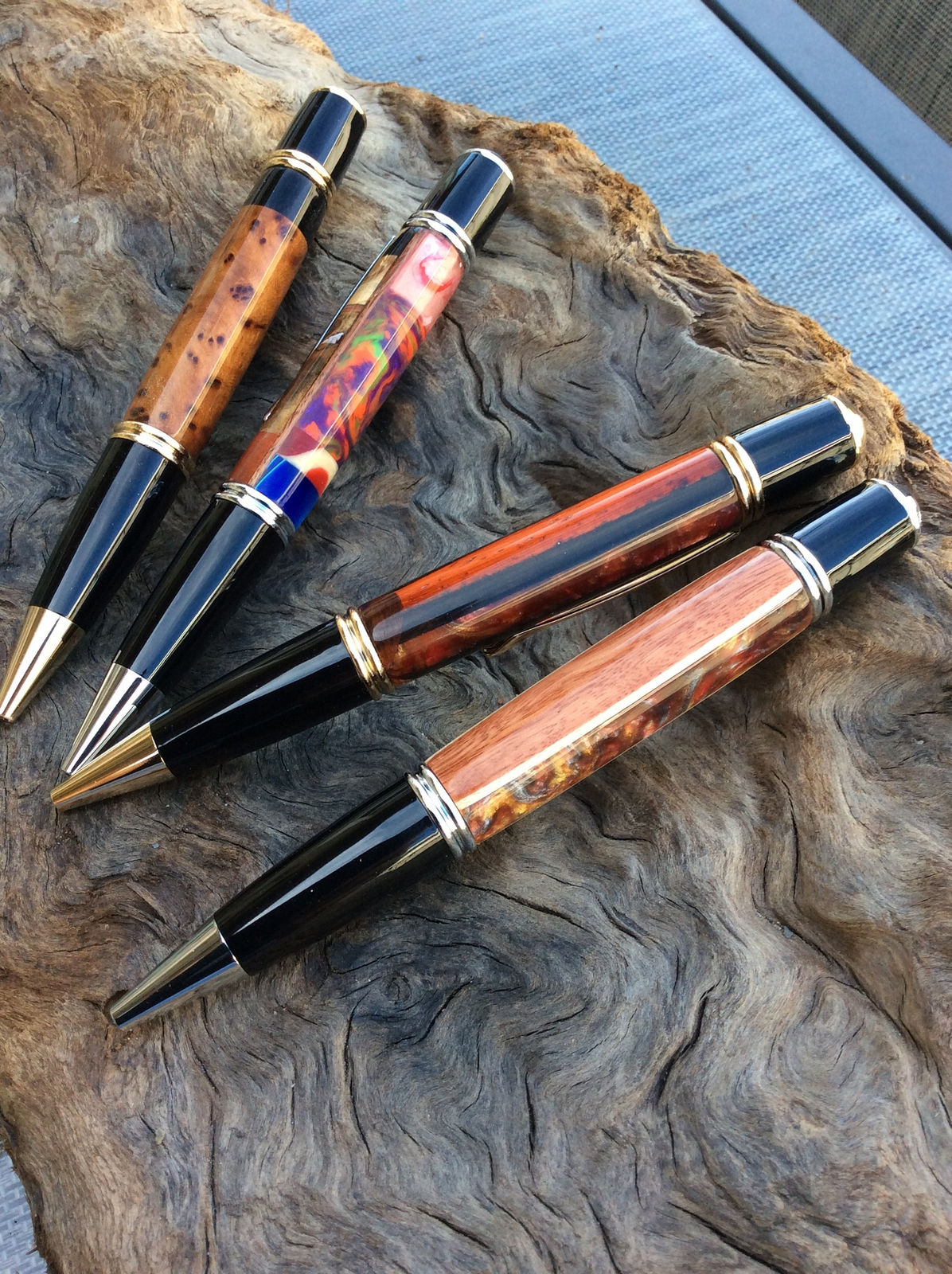 Did these this week. The top one is malee burl that cracked on me. Put in back on the lathe, trimmed the cracked section off, added a bit of ebony and refinished. The next is a chaos pen. Third is padaux, ebony, acrylic with chechen (sp?) scallops and the bottom is the same acrylic with she-oak and maple.