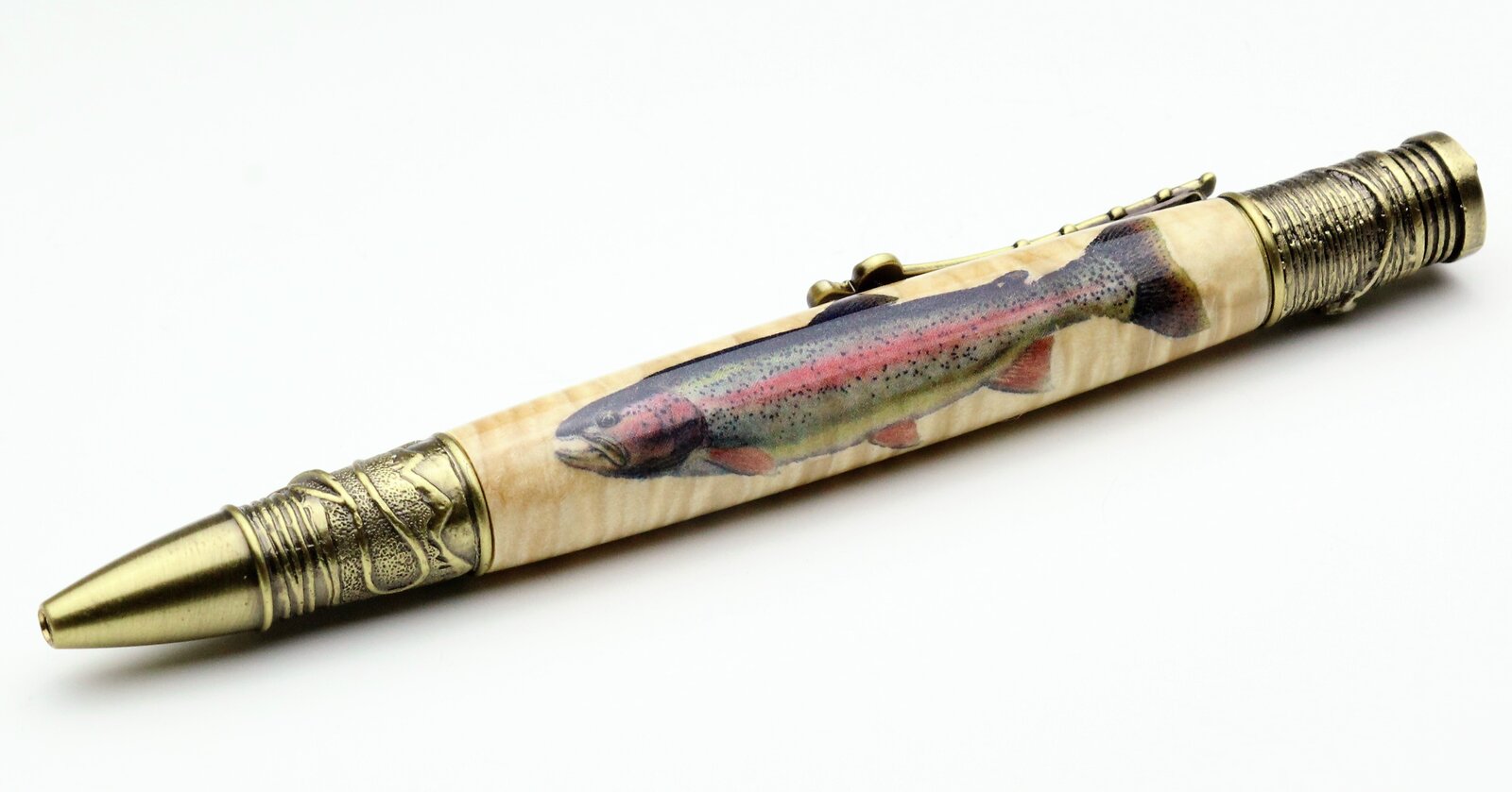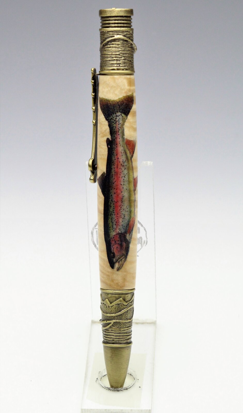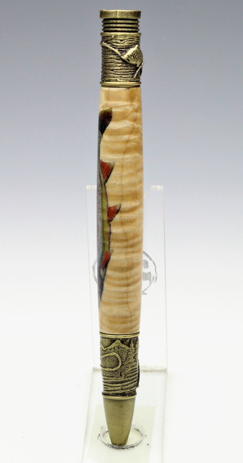Water slide Rainbow Trout decal, CA finish, curly maple.