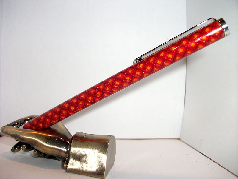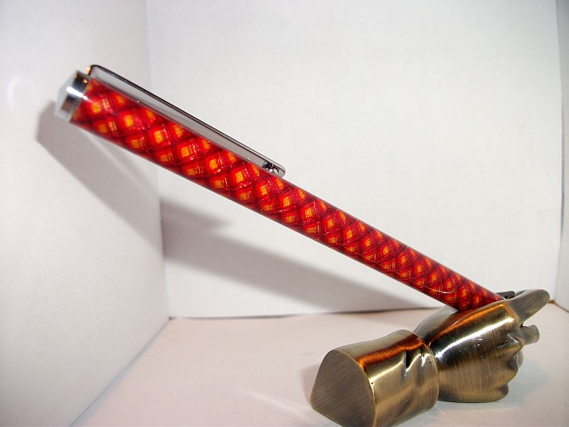 5 thread chrome stylus.yellow,orange,red,and maroon one way and metallic red the other.While I've been having trouble with lighter colors on top,having them laid down first seems to work better.Not a crisp scale pattern but more success than I been having.Gives ti a 3D effect.V-day gift for my little girl.