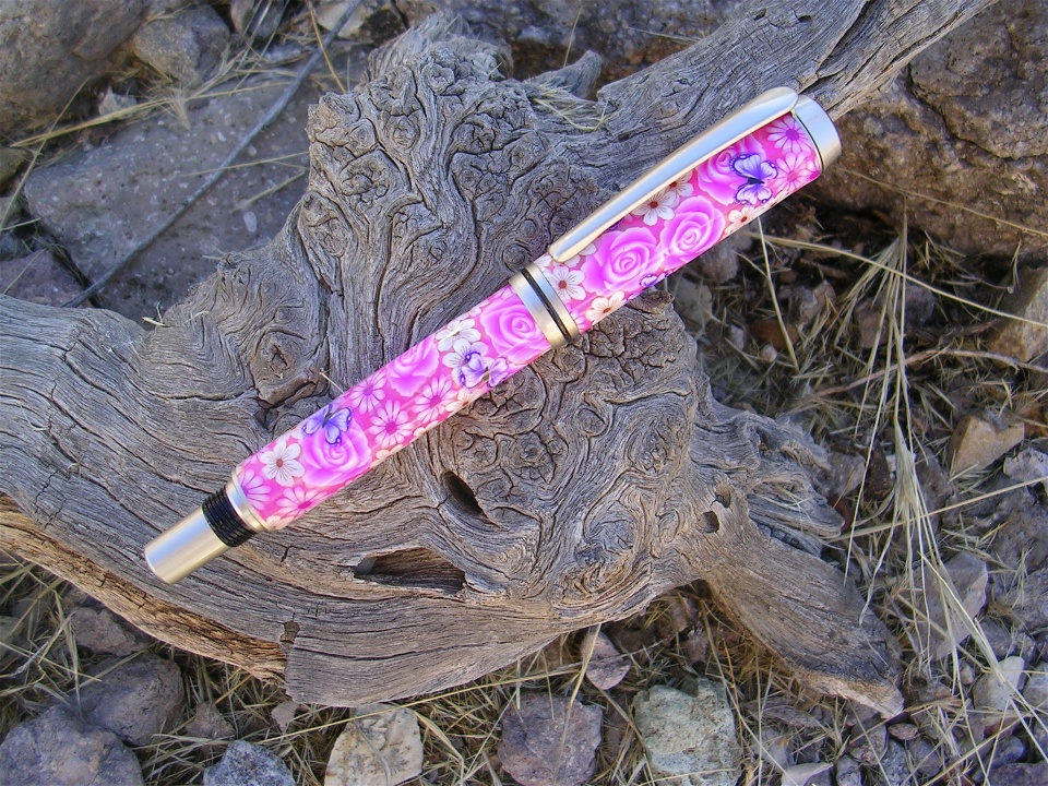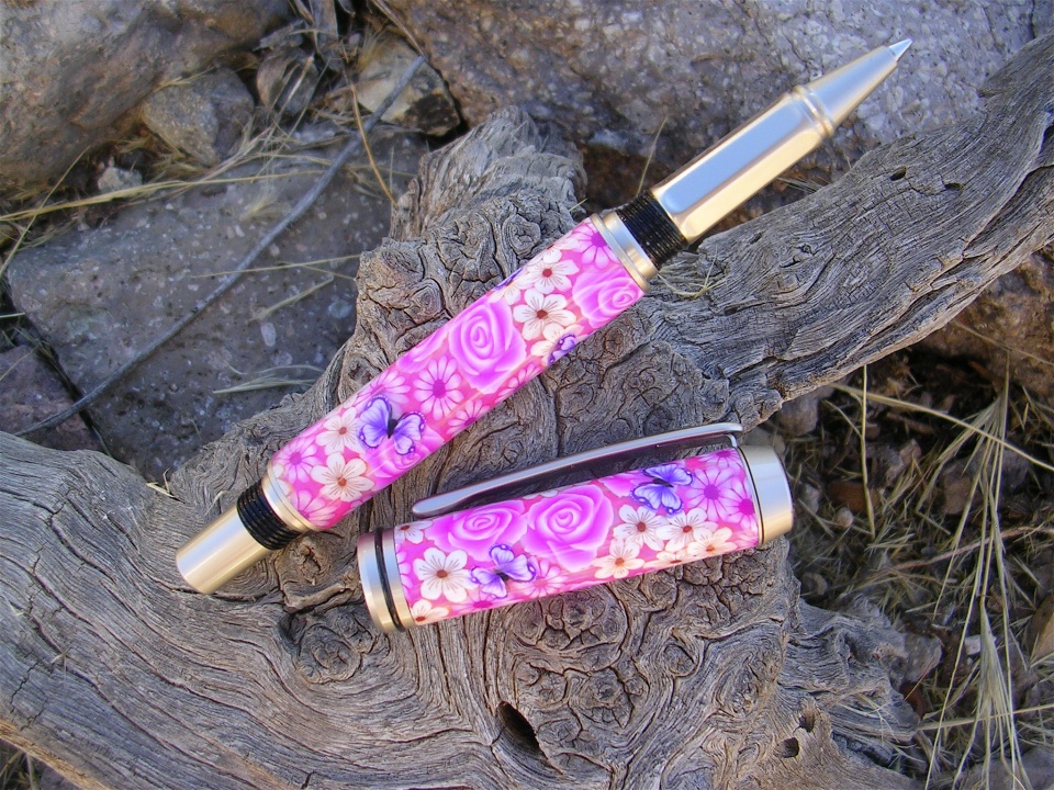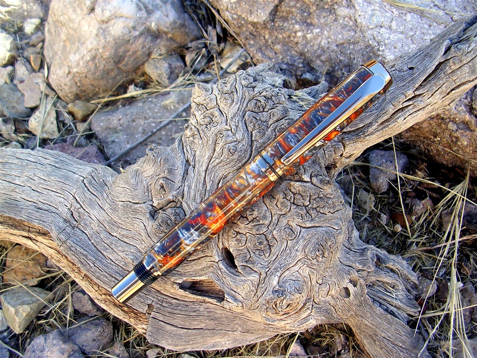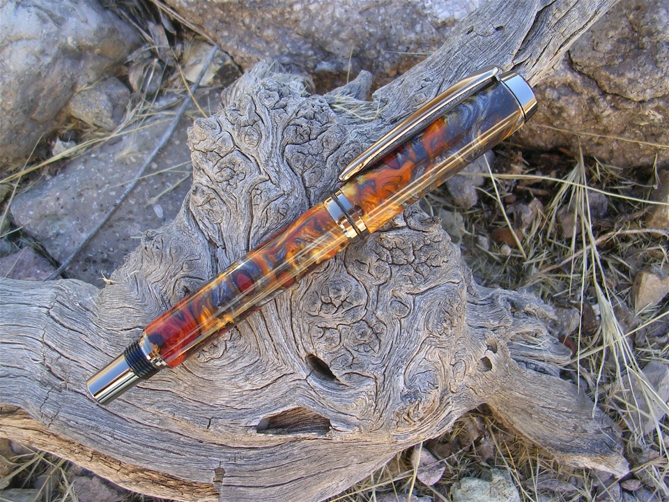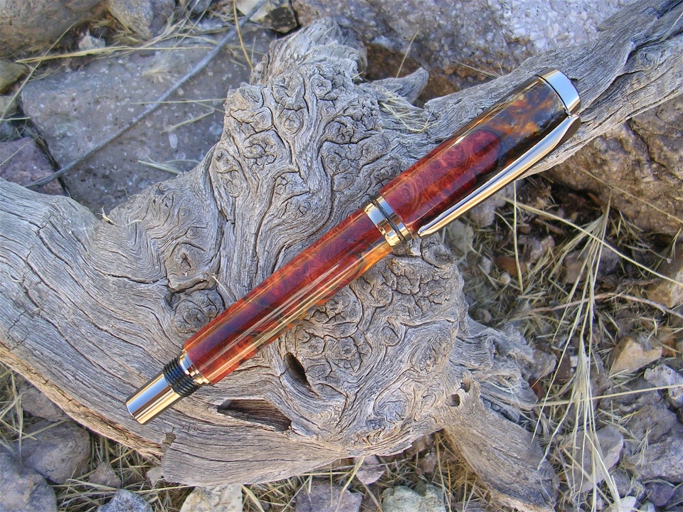 Blank are from BearToothWoods. Polymer Clay pre-tubed on a Satin Chrome Baron Silver Ore Lava Blank on a Gunmetal Baron Mutt Burl Cap/ Acylic Blank on a Gunmetal Baron ( Amboyna Burl most likely )