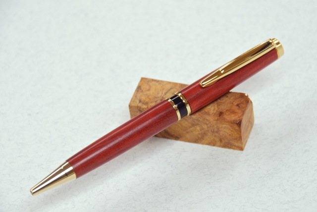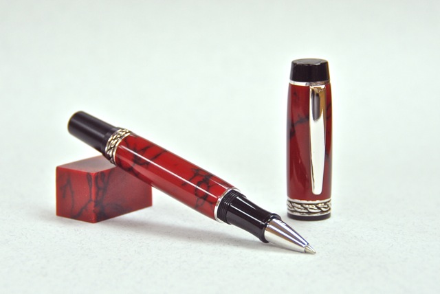 How nice to get back in the shop after the holidays, tho' I had to give it a good cleaning first before getting to play. The Bloody Basin Red Jasper is my first acrylic that actually made it to being a pen. I first had to blow up a computer chip blank that was supposed to be a Christmas present (insert long sigh here). The jasper is on a Olympian Elite2. The Spalted Pecan is on a Sierra Elegant button click and the Bloodwood is on a Hart Double Twist.